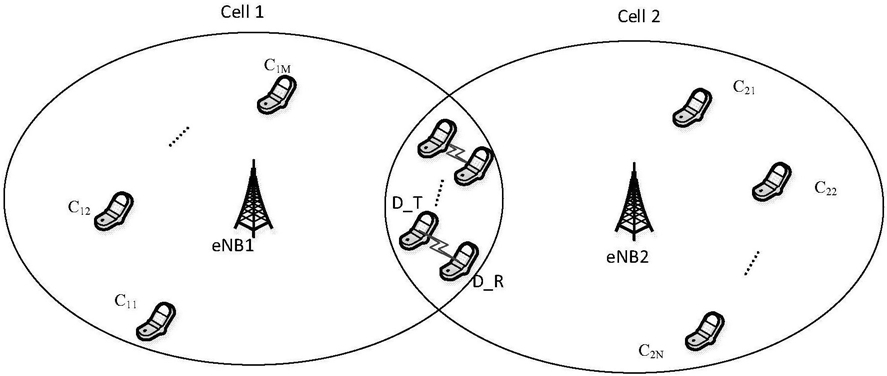 102、根据步骤101的小区1和小区2内的当前传输负载,分两种资源分配模型:A、如果小区2的当前传输负载大于小区1的当前传输负载,且小区1和小区2的当前传输负载之间的差值大于等于阈值M时,则小区1为轻负载小区,则由小区1的基站eNB1来负责D2D通信的资源分配,且复用的是轻负载小区1的频谱资源,跳转至步骤103进行资源分配;B、若小区1和小区2的当前传输负载之间的差值小于阈值M时,则由两基站协作进行小区间D2D资源分配,复用的是两小区中的频谱资源,跳转至步骤104进行资源分配;