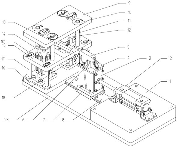 1.一种零件孔径柔性在线测量装置,其特征在于:在工作台(23)的一侧装有升降式可调节定位平台;在工作台(23)的中部装有导轨(8),基座(4)的底部经滑块(7)与导轨(8)构成滑动副,基座(4)顶部装有测量组件(5),测量组件(5)两侧的基座(4)顶部分别装有圆柱销,基座(4)的一侧面上装有连接板(3);在工作台(23)的另一侧装有底座(1),驱动气缸(2)装在底座(1)上,驱动气缸(2)的气缸杆与基座(4)的一侧面上的连接板(3)连接;