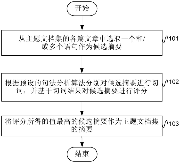 8.根据权利要求7所述的方法,其特征在于,所述根据预设的句法分析算法分别对所述第一候选长摘要进行切词,并且根据所述切词的结果和预设的第一摘要评价指标计算所述第一候选长摘要的评分值的处理还包括:对任一第一候选长摘要,根据其所属文章的信息来源对为其计算的评分值进行加权,求得所述第一候选长摘要的加权评分值,所述将所述评分值最高的第一候选长摘要作为所述主题文档集的长摘要的处理包括:选取求得的加权评分值最高的第一候选长摘要作为所述主题文档集的长摘要。