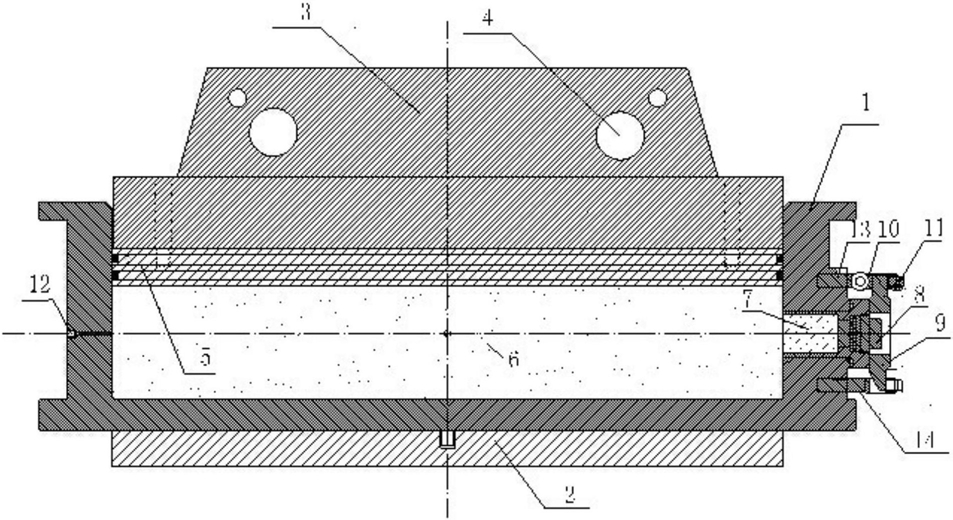 f.在压柱(3)的两个圆孔内插入两根承压杆(4),并在承压杆(4)外露段与长圆形缸体(1)上端面之间放入垫块,保持两者接触但不受力的状态;