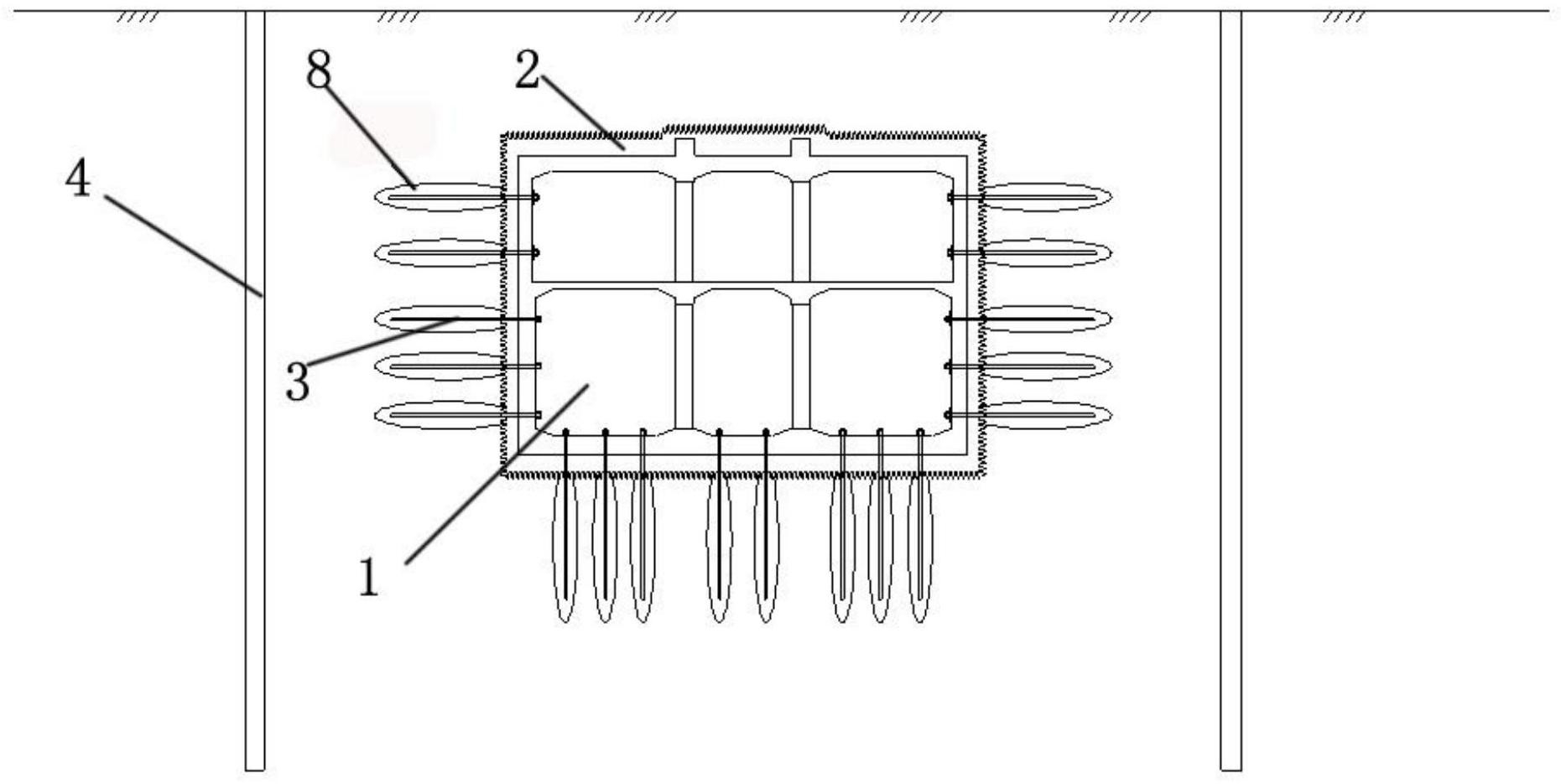 4.一种如权利要求1-3中任一项所述的地下结构的抗震加固结构的抗震加固方法,其特征在于包括如下步骤:第一步:设置减震层,在地下结构的侧板和底板外围,钻孔后通过钻孔高压注入泡沫树脂,形成减震层;