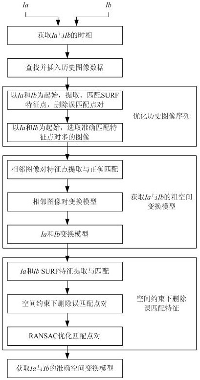 3.根据权利要求1所述的一种结合历史图像序列的大时间跨度遥感图像配准方法,其特征在于:步骤(3)中,所述准确匹配的特征对是通过提取特征、特征初匹配和RANSAC技术去除部分误匹配获得。