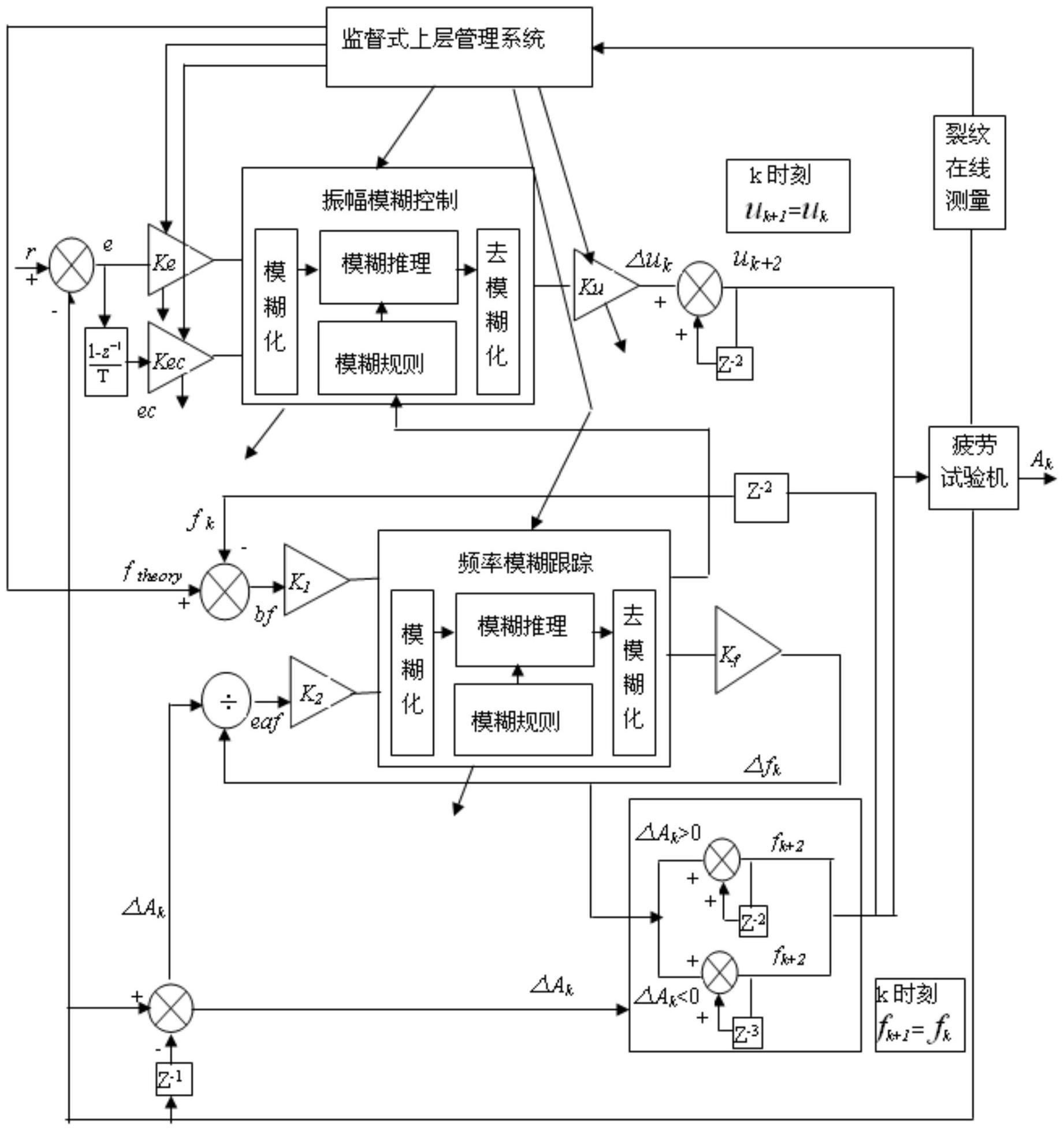 1.一种基于稳幅的谐振频率跟踪和振动载荷振幅联合控制系统,其特征在于:所述联合控制系统采用两层模糊控制器结构,上层为监督管理控制器,通过对裂纹扩展长度,载荷振幅和谐振频率的采样控制时刻的监测,对下层频率跟踪控制器和谐振区振幅控制器进行频率和振幅控制时序的规划和控制值的计算和输出,下层为频率跟踪控制器和谐振区振幅控制器。