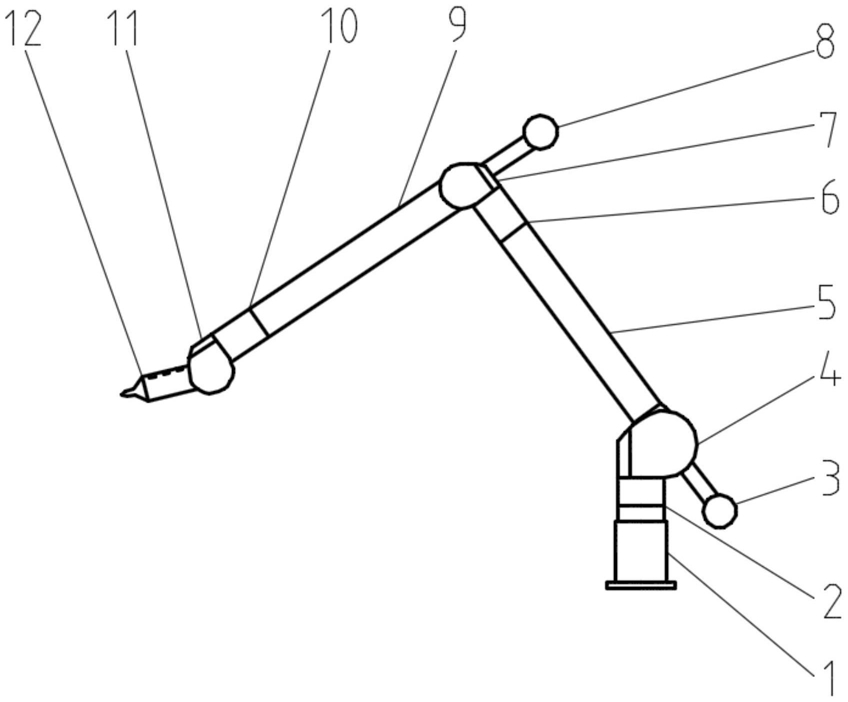 1.具有配重平衡装置的关节式坐标测量机,包括基座、第一配重杆、大臂、第二配重杆、小臂、肩关节活动件、肘关节活动件、腕关节活动件和测头,其特征在于:肩关节活动件的一端与基座构成第一回转副,另一端与大臂的一端构成第一摆动副;所述的第一配重杆固定在肩关节活动件上,且第一配重杆和大臂分设在肩关节活动件两侧;所述大臂的另一端与肘关节活动件的一端构成第二回转副,肘关节活动件的另一端与小臂的一端构成第二摆动副;所述的第二配重杆固定在肘关节活动件上,且第二配重杆和小臂分设在肘关节活动件两侧;所述小臂的另一端与腕关节活动件的一端构成第三回转副,腕关节活动件的另一端与测头构成第三摆动副;