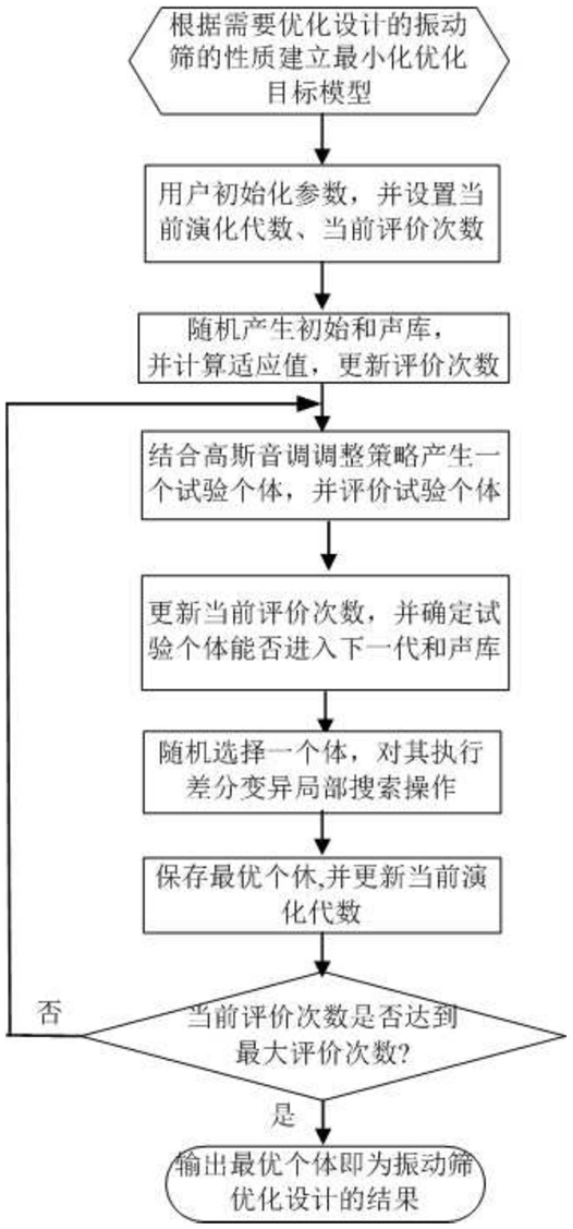 1.一种应用高斯和声搜索的振动筛优化设计方法,其特征在于,包括以下步骤:步骤1,根据待优化设计的振动筛的物理机械特性建立以下形式的最小化优化目标的数学模型:最小化振动筛的优化设计目标函数f(X),并满足优化设计约束条件:gk(X)≤0,k=1,