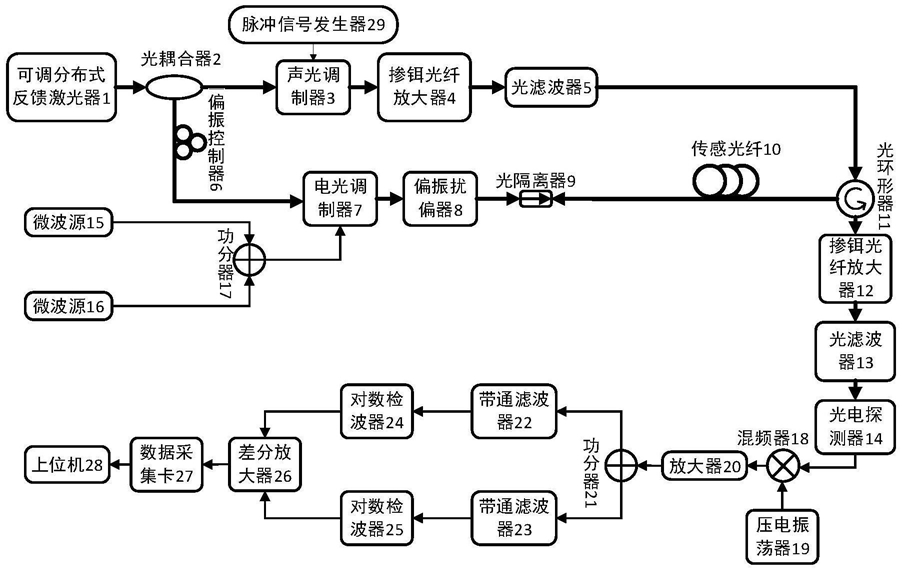 1.一种基于差分放大技术的分布式传感系统,其特征在于,由光路检测和电路解调两部分组成;光路上采用两种不同频率的微波信号调制到信号光上:一路微波信号的频率在布里渊频移频率内,另一路微波信号的频率较布里渊频移频率稍低;电路上则采用功分器将两路信号分开并分别滤波、解调,再进行差分放大的方式将解调后的信号放大,实现减去直流分量,减小量化噪声的目的,其具体结构为:可调分布式反馈激光器(1)输出的连续光经光耦合器(2)后分为两路,一路由声光调制器(3)调制后进入到掺铒光纤放大器(4)进行放大,经第一光滤波器(5)滤波进入光环形器(11);另一路光经偏振控制器(6)进入电光调制器(7)之后进入偏振扰偏器(8)、光隔离器(9),然后作为探测光进入传感光纤(10)后进入光环形器(11);通过光环形器(11),泵浦光与探测光在传感光纤中相遇,产生受激布里渊放大之后通过环形器进入接收端,即经掺铒光纤放大器(12)、第二光滤波器(13)后,由光电探测器(14)将光信号转换为电信号;之后再在混频器(18)中与压电振荡器(19)产生的9.8GHz本振信号混频,实现降频,通过放大器(20)放大进入第二功分器(21)后分成两路信号,分别通过两个不同频率的带通滤波器(22和23)和两个对数检波器(24和25)将信号分别解调出来,两路信号再同时进入差分放大器(26),实现差分放大,减去直流分量,之后用数据采集卡(27)采集并用上位机(28)处理;还包括第一功分器(17),所述第一功分器(17)接收两个微波源(15、16)混合产生一个调制电光调制器(7)的微波调制信号。