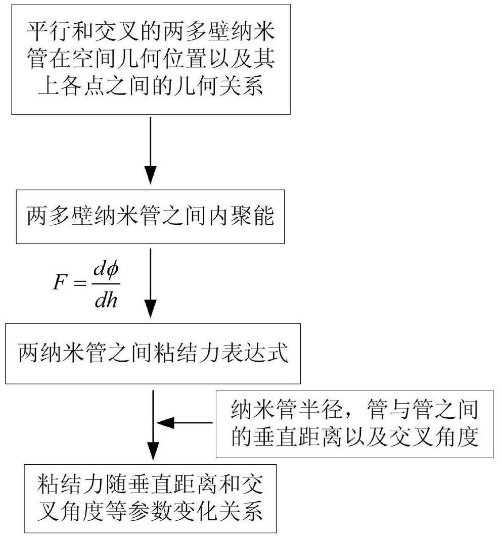 步骤3:对总体内聚能表达式进行求导处理,得到平行和交叉的两多壁纳米管之间粘结力的表达式;给定多壁纳米管半径,以及管与管之间的垂直距离和交叉角度,利用粘结力公式计算平行和交叉的两多壁纳米管之间粘结力。