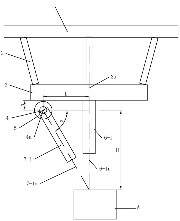 1.一种并联机构式坐标测量装置,并联机构包括上平台(1)、下平台(3)以及铰接在上平台(1)和下平台(3)之间的若干根能伸缩的连杆(2),其特征在于:在下平台(3)上固定有一号主观测装置(6-1),一号主观测装置(6-1)为一内置CCD数字相机望远镜,其视准轴称为一号主观测线(6-1a),一号主观测线(6-1a)与下平台(3)的中心线(3a)重合;在下平台(3)上还设有可以围绕自身轴心线旋转的定位轴(4),定位轴(4)的轴心线(4a)与一号主观测线(6-1a)成空间垂直,定位轴(4)上固定有一号副观测装置(7-1),一号副观测装置(7-1)为一激光器,其光轴称为一号副观测线(7-1a),一号副观测线(7-1a)与定位轴(4)的轴心线(4a)垂直相交,一号主观测线(6-1a)和一号副观测线(7-1a)处于同一平面,下平台(3)上设有用于测量定位轴(4)旋转角度的编码盘(5),定位轴(4)由电机驱动。