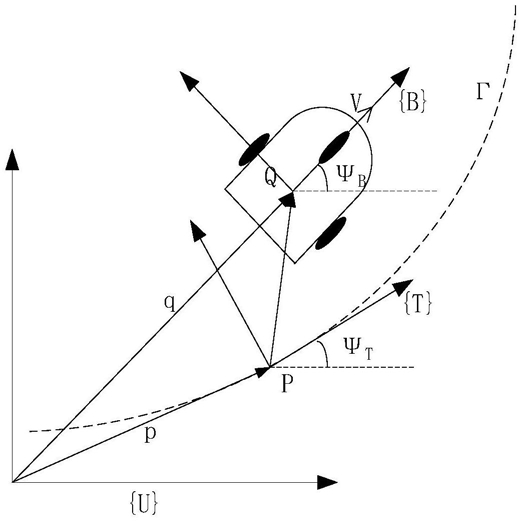 1)对移动机器人进行建模,以三轮移动机器人为对象,单个移动机器人i的连续系统偏差模型为:其中,(xe,i,ye,i,αe,i)表示移动机器人i相对于虚拟移动机器人i的方位偏差,包括x,y轴上的偏差xe,i,ye,i和运行线速度的角度偏差αe,i,虚拟移动机器人是在参考轨迹上按照设定运行状态运行的假想移动机器人,假设虚拟移动机器人i在跟踪点P附近,P点处的曲率为kP,i,k(si)为移动机器人i实际运行路线的曲率,vr,i为虚拟移动机器人i的线速度,si为移动机器人i的运行路程, 为si关于时间的倒数,ri虚拟移动机器人i的角速度;