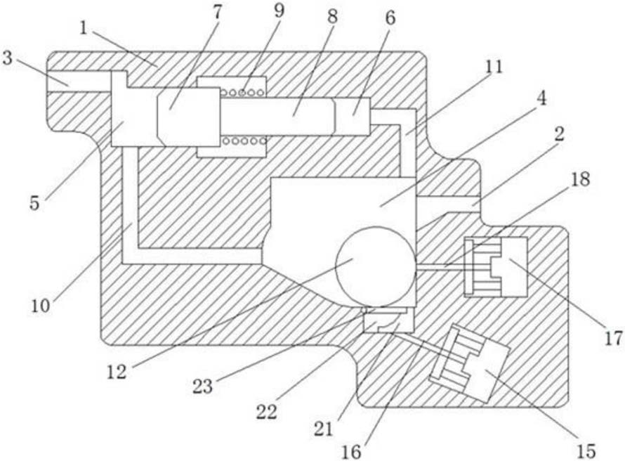 2.按照权利要求1所述的复杂路况下的重型车辆制动力自动调节装置,其特征在于,所述阀球两侧分别设置有沿阀球径向进行延伸的定位杆件,定位杆件同时平行于支撑端面中的第一端面与第二端面;所述第一腔体的侧端面之上设置有定位轨道,定位轨道平行于支撑端面进行延伸,且其与支撑端面之间的垂直距离与阀球的半径相等,所述定位杆件对应延伸至其所在侧边的定位轨道内部;所述定位杆件的端部设置有定位轮,定位轮位于定位轨道内部,且其可沿定位轨道进行滚动。