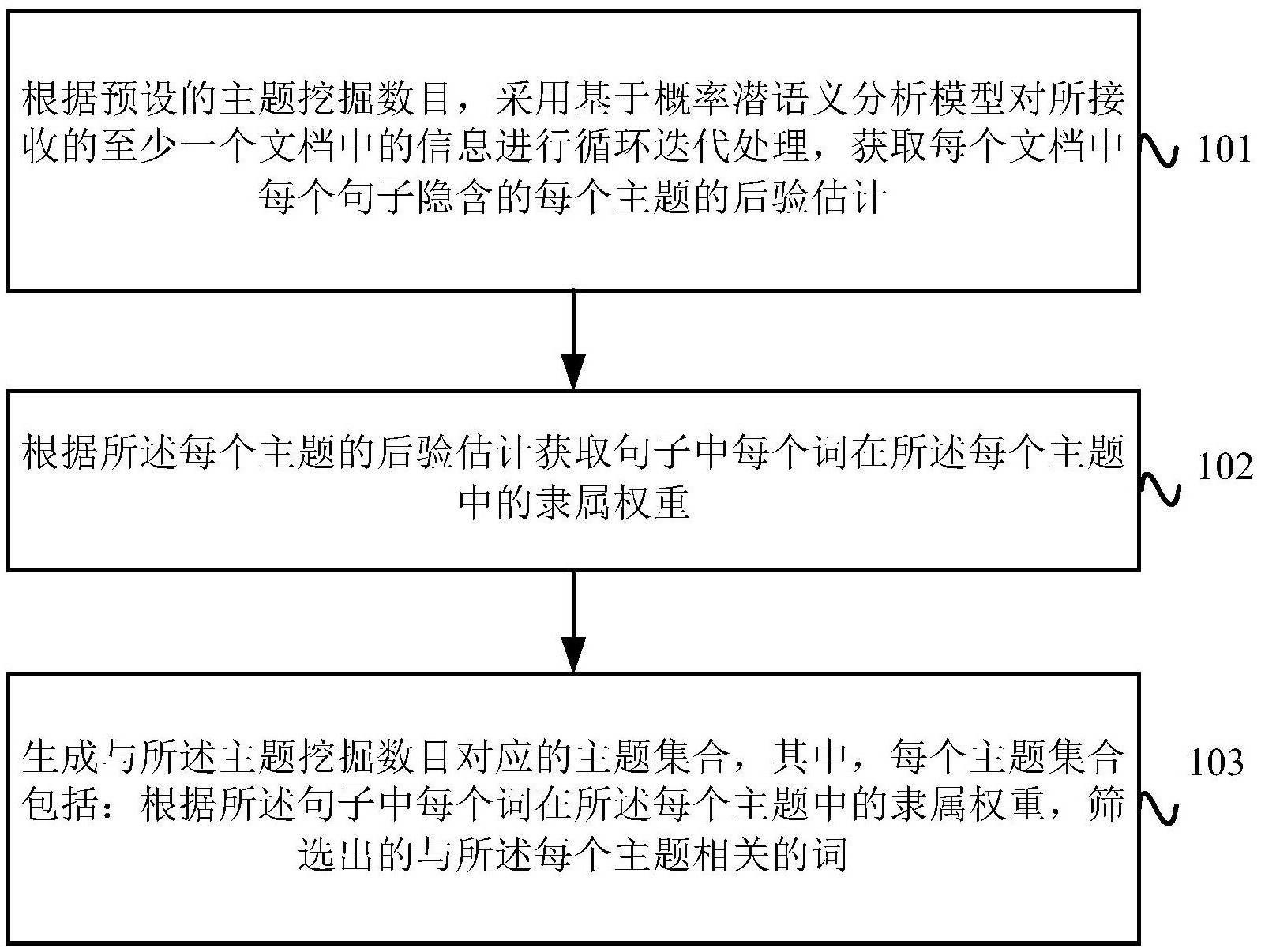 处理模块,用于根据预设的主题挖掘数目,采用基于概率潜语义分析模型对所接收的至少一个文档中的信息进行循环迭代处理,获取每个文档中每个句子隐含的每个主题的后验估计;