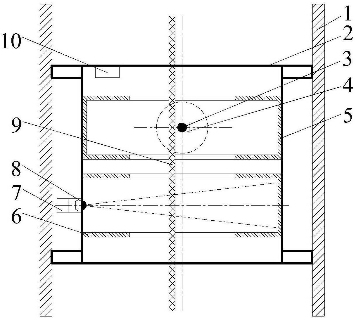 1.立井提升钢丝绳横向摆动位移检测装置,其特征在于:它包括支撑架(2)、纵向激光器(3)、纵向摄像头(4)、纵向遮光罩(5)、横向激光器(8)、横向摄像头(7)、横向遮光罩(6)、信号处理器(10);所述的支撑架(2)固定在立井提升井口井架(1)上,支撑架(2)的纵横向两个面上分别设有纵向激光器(3)和横向激光器(8),并设有分别包裹纵向激光器(3)和横向激光器(8)所发光幕的横向遮光罩(6)和纵向遮光罩(5),纵横向两个激光器位于各自遮光罩内的中间位置,激光器的激光发射方向与摄像头的拍摄方向一致,纵横两个激光器的激光发射方向相互垂直;纵向激光器(3)和横向激光器(8)的后部分别设有纵向摄像头(4)和横向摄像头(7),所述支撑架(2)内部顶壁上设有信号处理器(10),所述横向激光器(8)、横向摄像头(7)、纵向激光器(3)、纵向摄像头(4)分别经信号线与信号处理器(10)相连接,信号处理器(10)控制纵横向两个激光器的开闭,同时控制纵横向两个摄像头分别对钢丝绳(9)纵横两个面拍摄激光器照射到后在支撑架(2)内壁上的投影图像,并将信号传送给信号处理器(10);所述的支撑架(2)、横向遮光罩(6)、纵向遮光罩(5)的顶部和底部分别设有通过钢丝绳(9)的圆孔,圆孔的直径超过钢丝绳(9)的横向摆动范围。