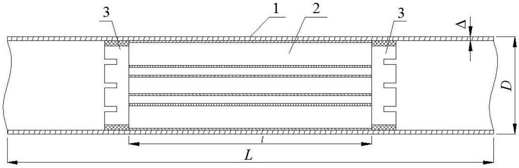 所述的吸能元件(2)置于薄壁管件(1)内,吸能元件(2)位于冲击荷载附近以吸收动能减小薄壁管件(1)横截面扁化,吸能元件(2)用固定元件(3)固定,吸能元件(2)尺寸为,(η>1), L、D和Δ分别是薄壁管件(1)的长度、外径和厚度,l、d和δ分别是多层复合圆筒的长度、外径和厚度;