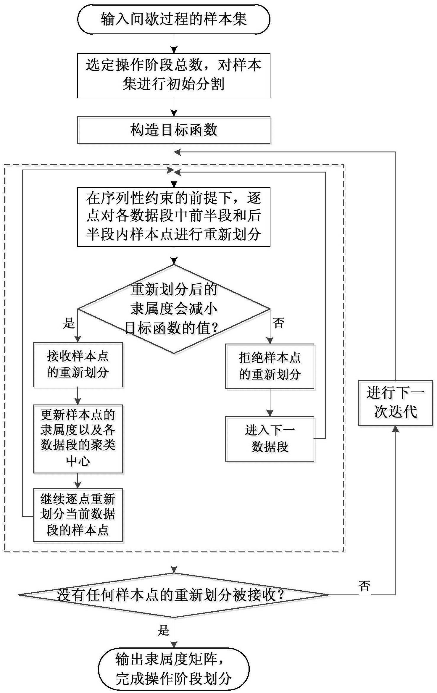 (3)构造目标函数,在满足严格序列性约束的前提下,逐点对各数据段中前半段和后半段内样本点进行重新划分,并计算样本点重新划分后的隶属度,如果由该样本点隶属度变化所引起的目标函数变化为负,接收这一重新划分,并更新该样本点的隶属度以及各数据段的聚类中心,继续重新划分当前数据段的下一个样本点,否则拒绝这一重新划分,跳转到下一数据段逐点进行重新划分;