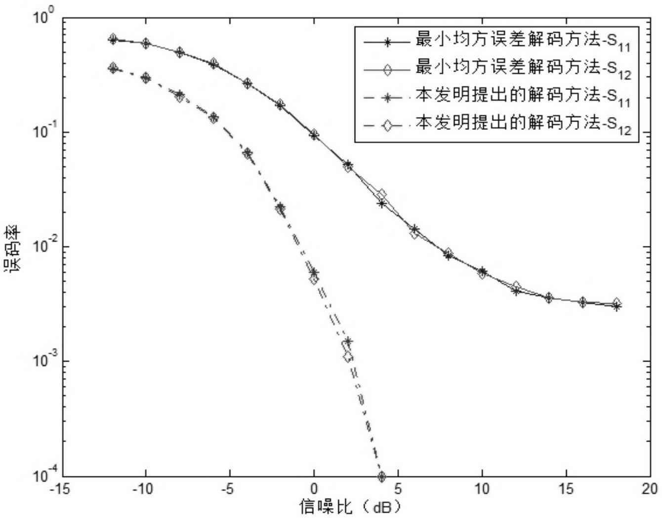 取定Slp,l=1 ,2… ,L,Slp为T1维向量,它的每个分量独立地取自某一QAM,得到Xlp=(GlpSlp)t,Glp为矩阵,令则有,上述式子,把V1看成高斯噪声,解出第1,2,…,L个基站中第p个用户之外的所有用户的信息S1k,S2k,…,SLk,1≤k≠p≤K,相应的解记为第2步:令则得到X;计算第3步:令可解得即完成了对Slp,l=1 ,2…,L,1≤p≤K,的解码;第4步:利用步骤四的第1至3步,即能解出所有用户的信息完