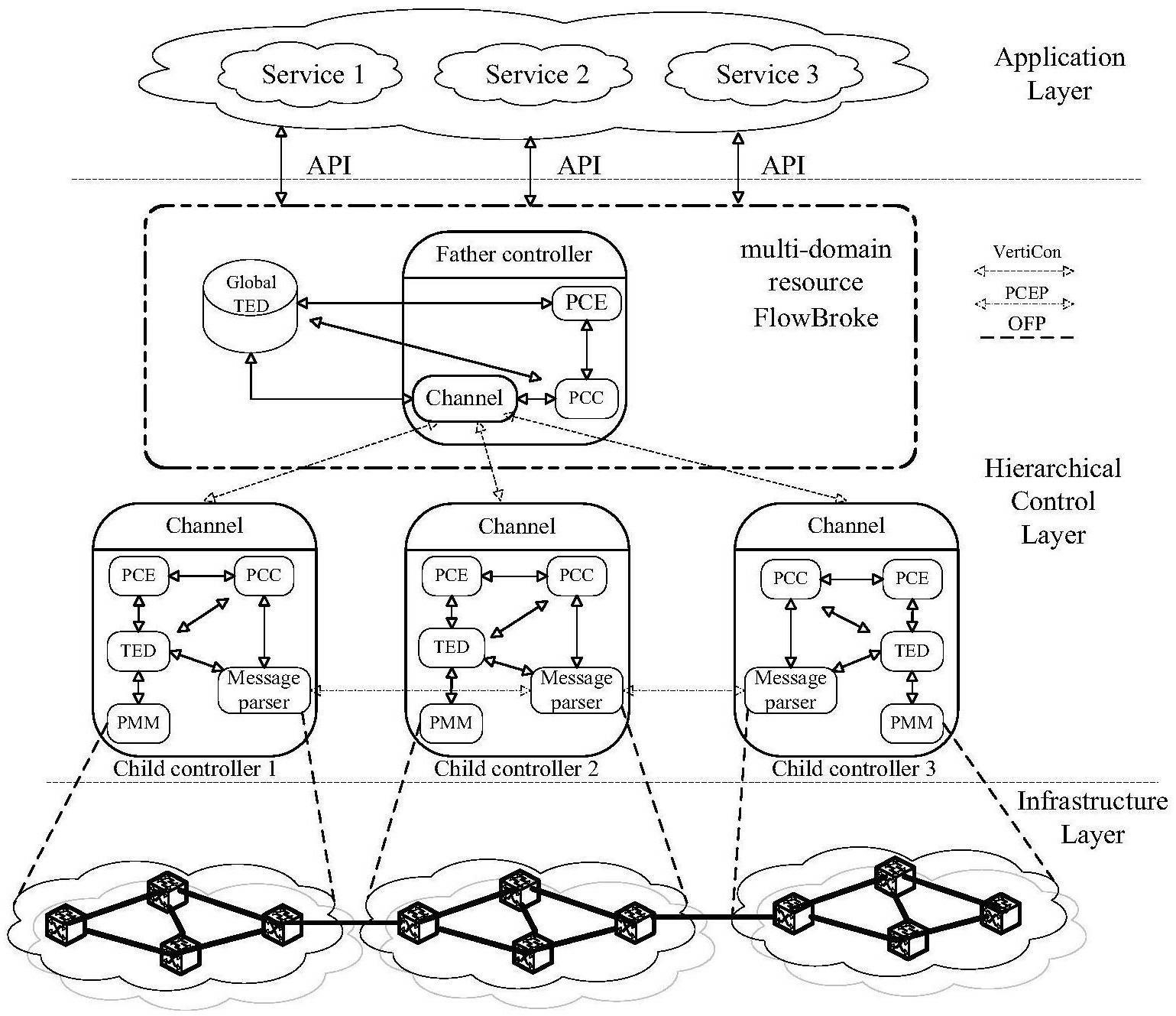 步骤4:根控制器将路由和资源分配结果传递给该路由对应的各子控制器,各子控制器根据根控制器计算的路由和资源分配结果分别完成域内和域间的路由和频谱资源分配;