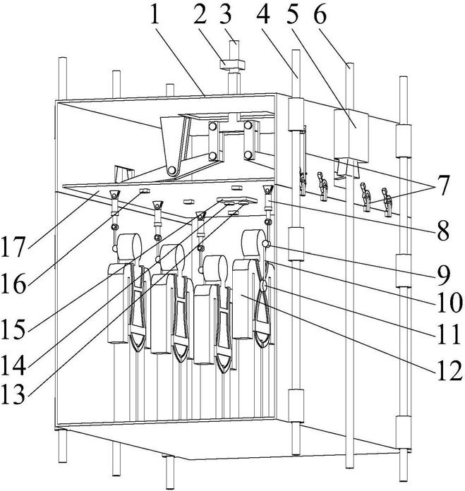 3.根据权利要求1所述的立井提升机断绳坠罐事故脱罐式矿工安全保护装置,其特征在于:所述的液压缸(8)、电磁比例溢流阀(16)和卷收器(9)成套安装,其数量与安装在顶板(17)下方的位置依据罐笼(1)中容纳矿工(12)的数量和站立的位置确定。
