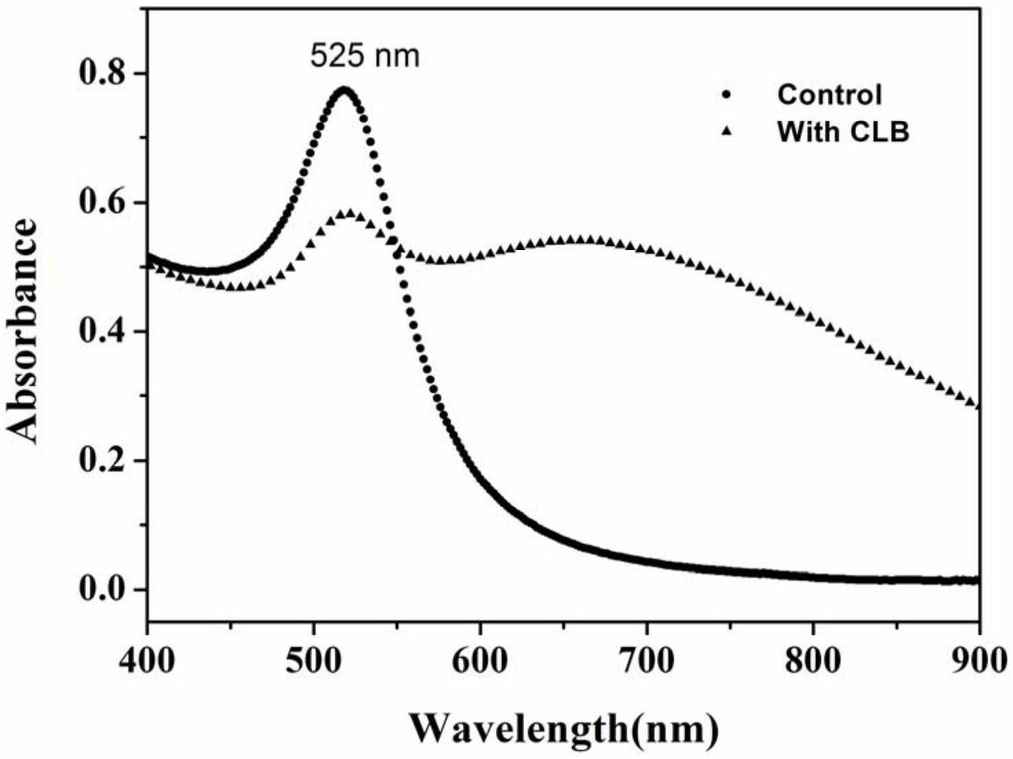 (4)对比第二混合液与第一混合液的颜色,若存在颜色变化,则待检测溶液中存在瘦肉精,若不存在颜色变化,则待检测溶液中不存在瘦肉精,或者,对比第二混合液与第一混合液的紫外可见吸收强度、峰值,若其紫外可见吸收强度、峰值发生变化,则待检测溶液中存在瘦肉精,若没有发生变化,则待检测溶液中不存在瘦肉精;