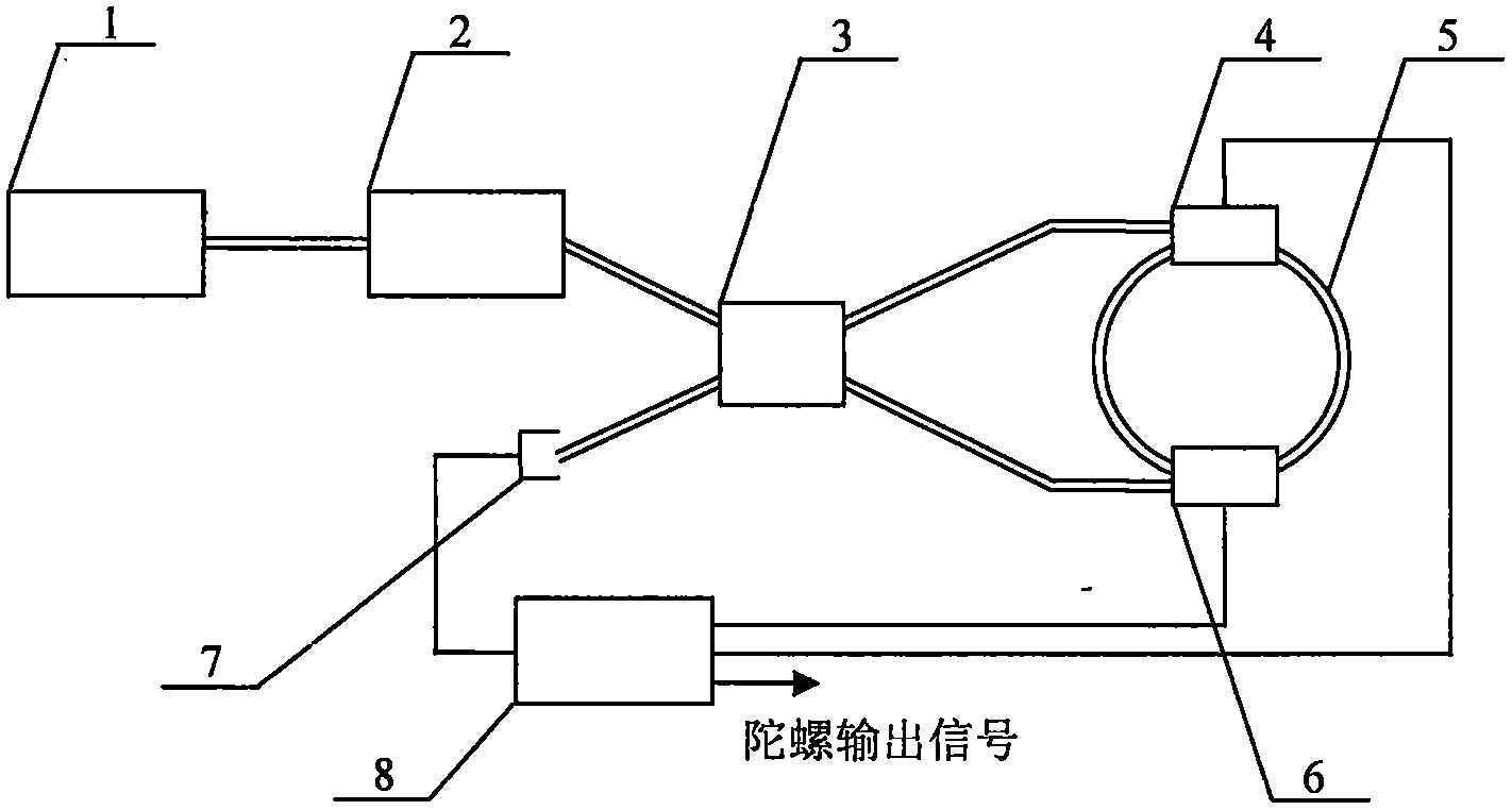 1.一种基于光纤环形谐振腔的灵敏度可调干涉式光纤陀螺,包括激光器(1)、偏振控制器(2)、第一光纤耦合器(3)、第二光纤耦合器(4)、光纤环(5)、第三光纤耦合器(6)、探测器(7)和信号处理及反馈系统(8);其特征在于:激光器(1)的光输出端与偏振控制器(2)的光输入端连接,偏振控制器(2)的光输出端与第一光纤耦合器(3)的光输入端连接,第一光纤耦合器(3)的第一光输入输出端与第二光纤耦合器(4)的第一光输入输出端连接,第二光纤耦合器(4)的第二光输入输出端和第三光纤耦合器(6)的第二光输入输出端通过光纤环(5)连接,第二光纤耦合器(4)的第三光输入输出端和第三光纤耦合器(6)的第三光输入输出端通过光纤环(5)连接,第三光纤耦合器(6)的第一光输入输出端与第一光纤耦合器(3)的第二光输入输出端连接,第一光纤耦合器(3)的光输出端与探测器(7)的光输入端连接,探测器(7)的信号输出端与信号处理及反馈系统(8)的信号输入端连接,信号处理及反馈系统(8)的第一信号输出端与第二光纤耦合器(4)的调制信号输入端连接,信号处理及反馈系统(8)的第二信号输出端与第三光纤耦合器(6)的调制信号输入端连接,同时信号处理及反馈系统(8)产生陀螺输出信号;所述第二光纤耦合器(4)、光纤环(5)和第三光纤耦合器(6)组成光纤环形谐振腔,通过探测经光纤环形谐振腔相向传输的两束光的干涉光强实现大范围测量旋转速度;所述第二光纤耦合器(4)和第三光纤耦合器(6)的耦合比能够调节;该光纤陀螺利用信号处理及反馈系统(8)产生调制信号控制第二光纤耦合器(4)和第三光纤耦合器(6)的耦合比,从而实现灵敏度的调节。