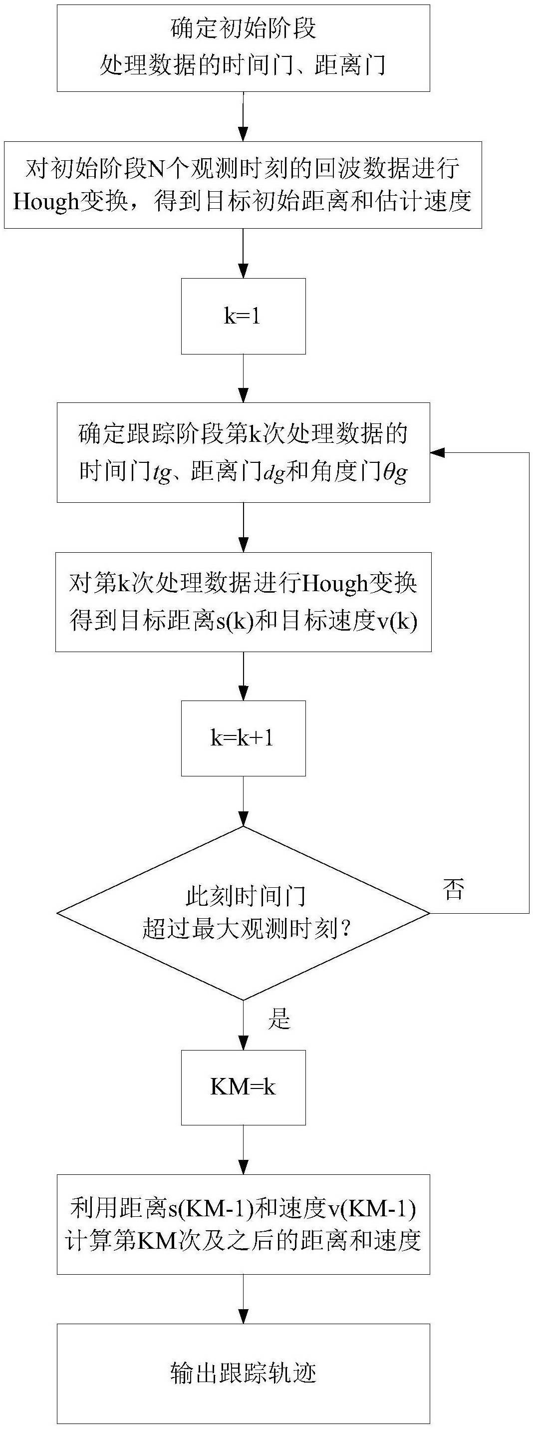 4.根据权利要求1所述的基于Hough变换的弱目标运动轨迹提取方法,其特征在于,所述步骤4)中跟踪阶段的时间门tg的选取固定为从当前观测时刻开始的tk个时间单元,tk为跟踪阶段每个时间门内包含的时间单元数目。