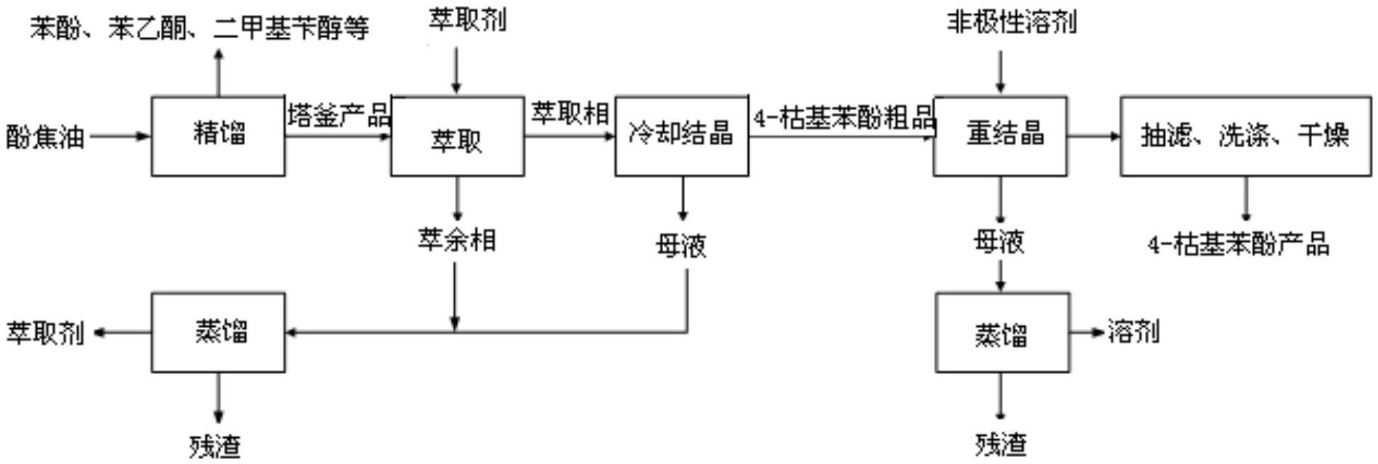 2.根据权利要求1所述的一种从酚焦油中提取精制4-枯基苯酚的方法,其特征在于,得到纯度大于99wt%的4-枯基苯酚产品后,对步骤(2)中的萃余相、步骤(3)中的结晶母液以及步骤(4)中的重结晶母液进行蒸馏,回收萃取剂和溶剂。