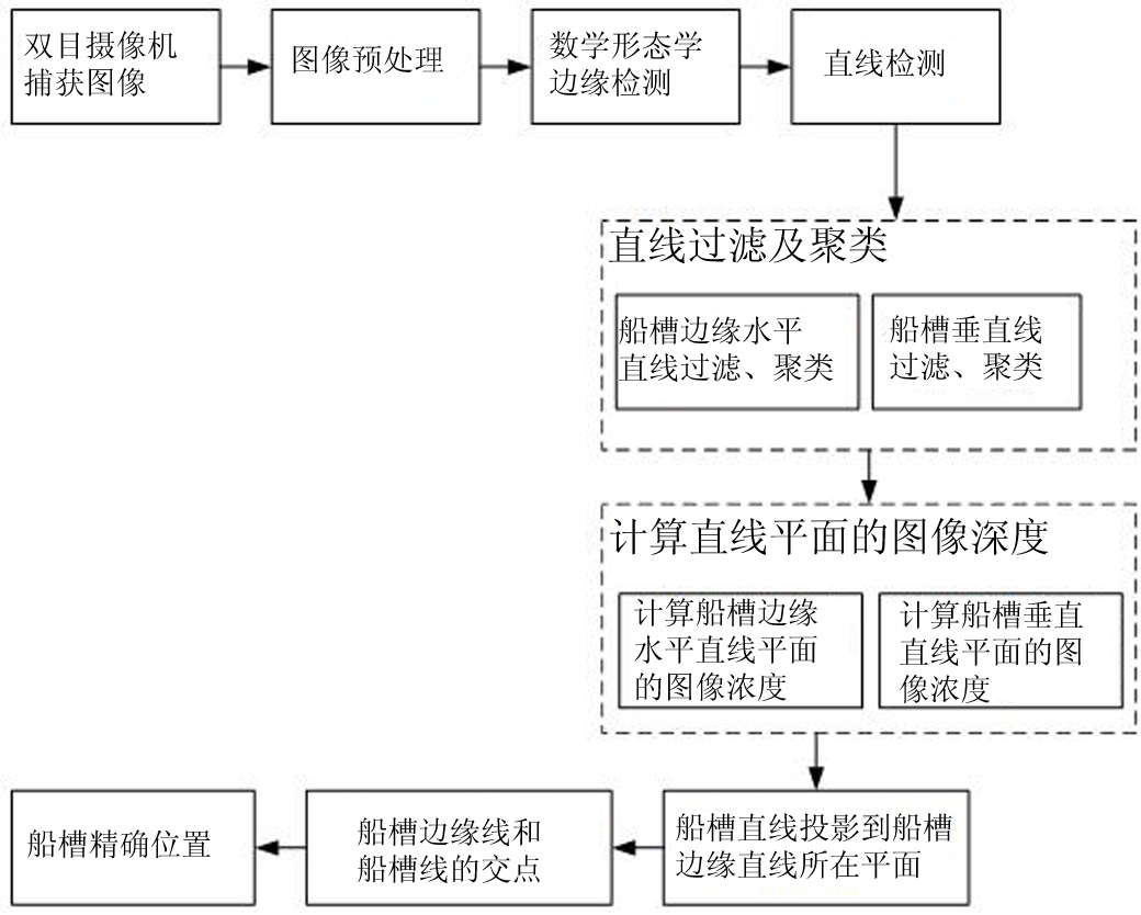 1.一种基于计算机视觉的船槽定位方法,其特征在于包括双目摄像机捕获图像、图像预处理、数学形态学边缘检测、直线检测、直线过滤及聚类、计算各直线所在平面的图像深度、船槽直线投影到船槽边缘直线平面、求船槽边缘线和船槽线的交点及船槽精确定位,具体包括以下步骤:步骤1:使用已知内参的双目视觉系统对船槽成像,得到双目图像I1和I2;