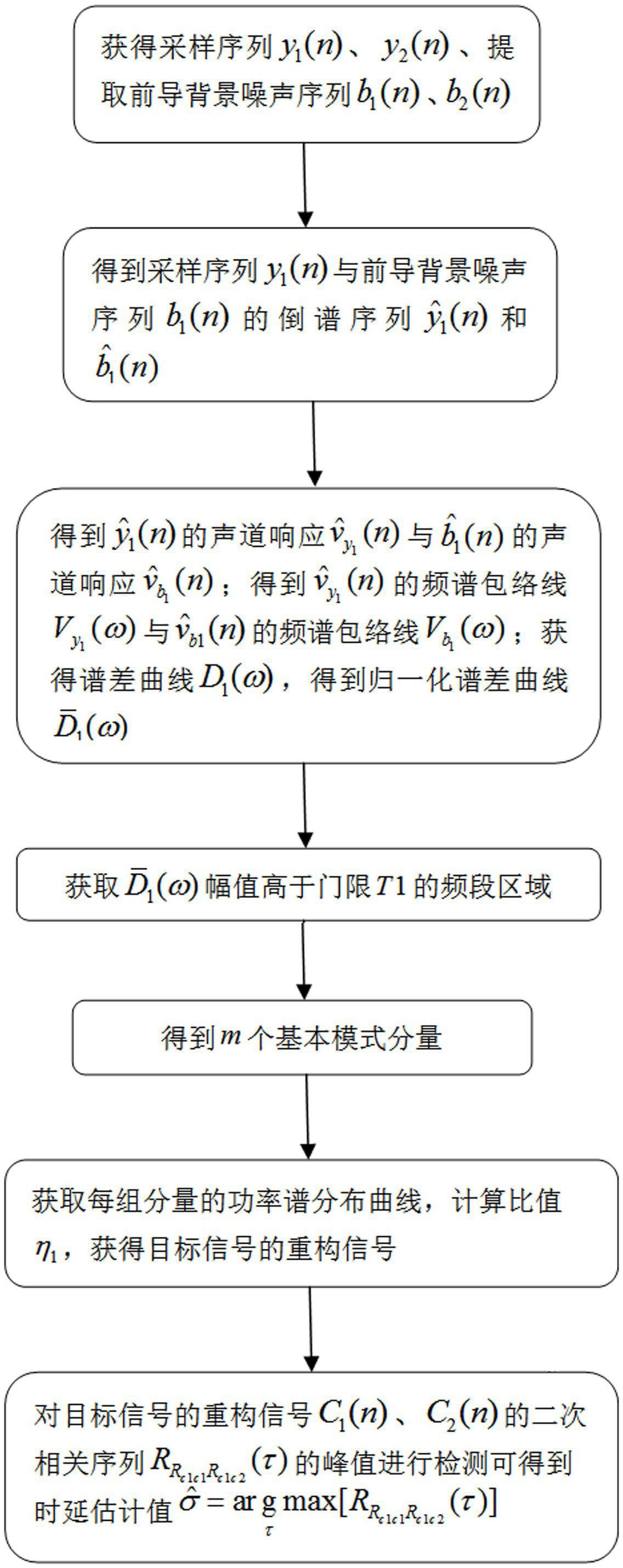 1)采集两路目标信号,获得两路目标信号的采样序列y1(n)、y2(n),并提取两路目标信号信道的前导背景噪声序列b1(n)、b2(n),因为两路目标信号到达两接收传感器时存在时延差σ,因此采样序列y1(n)与y2(n)之间也存在时延σ;