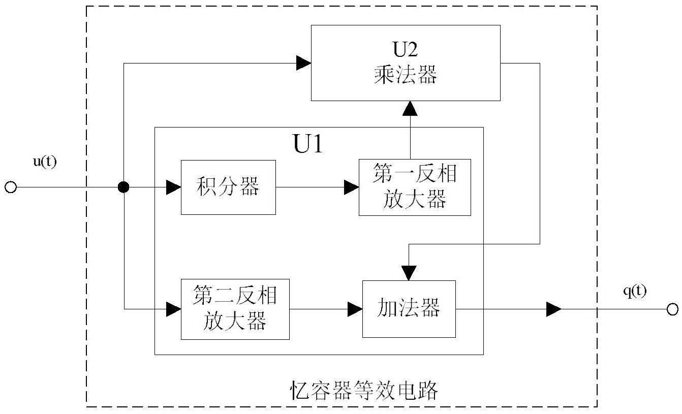 1.一种忆容器仿真器的电路,包括集成运算放大器U1和乘法器U2,其特征在于:集成运算放大器U1用于实现积分器运算、反相放大器运算和加法器运算;积分器用于实现输入信号的积分,再通过第一反相放大器实现积分信号的反相放大,将反相放大后的信号输入到乘法器U2,乘法器U2的另一端与输入信号相连,乘法器U2用于实现信号的相乘;输入信号再通过第二反相放大器实现输入信号的反相放大,将反相放大后的信号输入到加法器,同时将通过乘法器U2相乘后的信号输入到加法器,加法器用于实现信号的求和运算,最终得到输出电荷量。