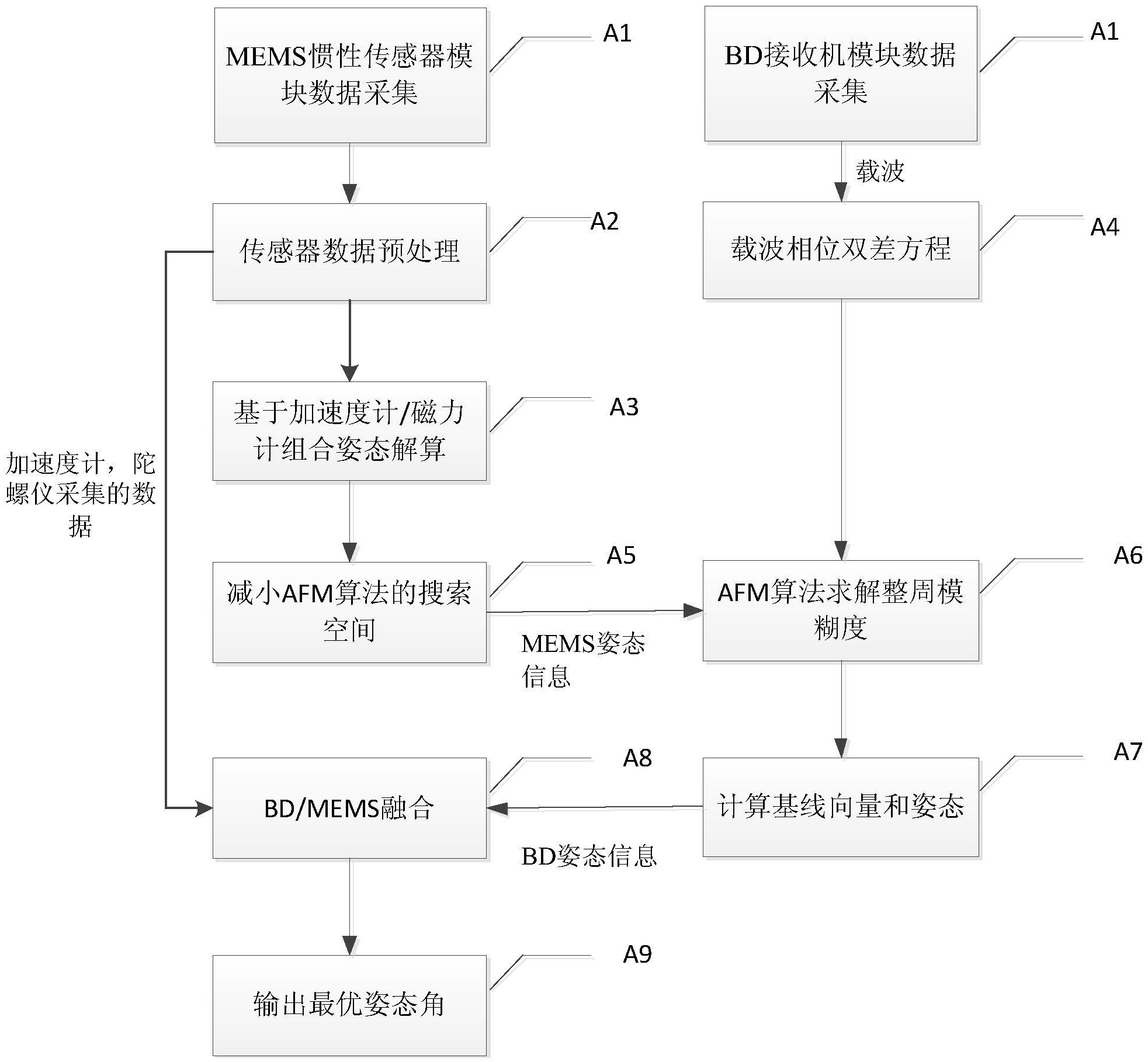 2.根据权利要求1所述的一种低成本高精度BD/MEMS融合姿态测量方法,其特征在于:在步骤6中,将步骤5中求出的整周模糊度最优解带入载波相位双差方程通过最小二乘算法求得对应的基线向量bLS=(ATA)-1ATλ(▽Δφij+N)进而求出利用BD信息解算的姿态角(yBD,pBD)。