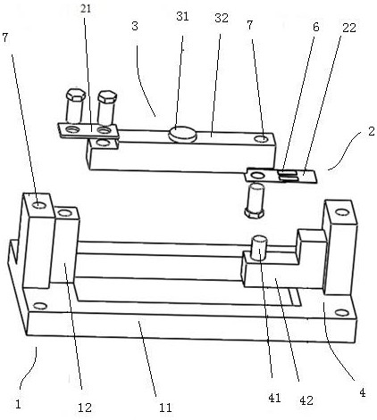 1.一种微力及微位移放大传感器,包括固定结构(1)、应变结构(2)、施力结构(3),其特征是,还包括设置在应变结构(2)下方的过载保护结构(4),过载保护结构由限位杆(41)与支撑刚性体(42)构成;
