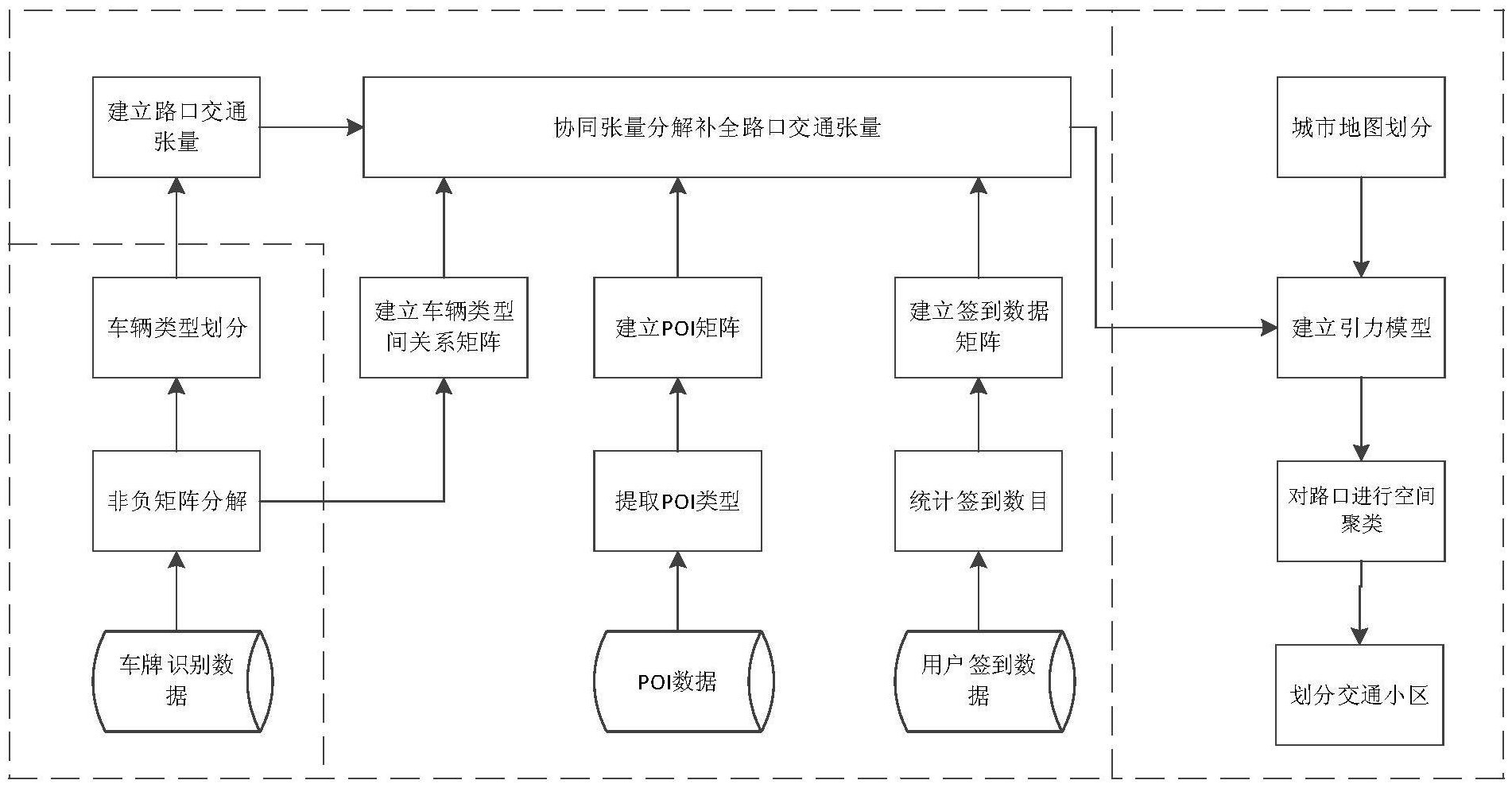 3.如权利要求2所述的基于稀疏车牌识别数据挖掘的交通小区划分方法,其特征在于,路口数据补全阶段具体包括:步骤2-1,读取所述车牌识别数据,计算每个可监测路口各个时间段内经过的不同类型车辆的数目,建立反映路口交通状况的张量并归一化;
