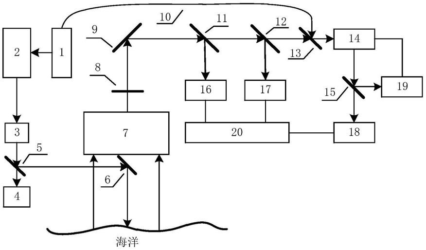 2.根据权利要求1所述的探测海洋浮游植物生物量和POC的激光雷达装置,其特征在于当系统为非偏振的高光谱分辨率激光雷达时,包括发射系统、接收系统、锁频系统、数据采集及处理系统;发射系统包括基频单纵模连续激光器、倍频单纵模脉冲激光器、扩束器、光电探测器、分光镜、反射镜;接收系统包括望远镜、窄带滤波片、反射镜、分光镜、两个倍频/基频二向色分光镜、干涉鉴频器和两个光电探测器;锁频系统包括基频单纵模连续激光器、单模光纤、干涉鉴频器、两个倍频/基频二向色分光镜和光电探测器;基频单纵模连续激光器发出的连续光经倍频后在倍频单纵模脉冲激光器中发生谐振,使倍频单纵模脉冲激光器发射的脉冲光具有单模特性;脉冲光经扩束器后由分光镜分为两路,较弱透射光由光电探测器监视出射的光强变化,较强反射光在望远镜下方经反射镜后射入海洋;望远镜收集海洋的回波信号后由窄带滤波片滤除背景光,经反射镜导入接收系统;回波信号由分光镜(12)分为两束光,一束光由接收系统的一个光电探测器(17)接收,称为混合通道;另一束光透过倍频/基频二向色分光镜(13)后,经干涉鉴频器滤除海洋颗粒米散射信号,透过海洋布里渊分子散射信号,并透过倍频/基频二向色分光镜(15)由接收系统的另一个光电探测器(18)接收,称为分子通道;利用单模光纤将基频单纵模连续激光器发射的连续光射向倍频/基频二向色分光镜(13),经倍频/基频二向色分光镜(13)反射入干涉鉴频器,由倍频/基频二向色分光镜(15)反射被光电探测器(19)接收,并反馈给干涉鉴频器使其锁定于倍频单纵模脉冲激光器;接收系统的两个光电探测器得到的光信号由数据采集及处理系统进行光电转换、采集和数字化,并将其进行海洋浮游植物生物量和POC的反演分析。
