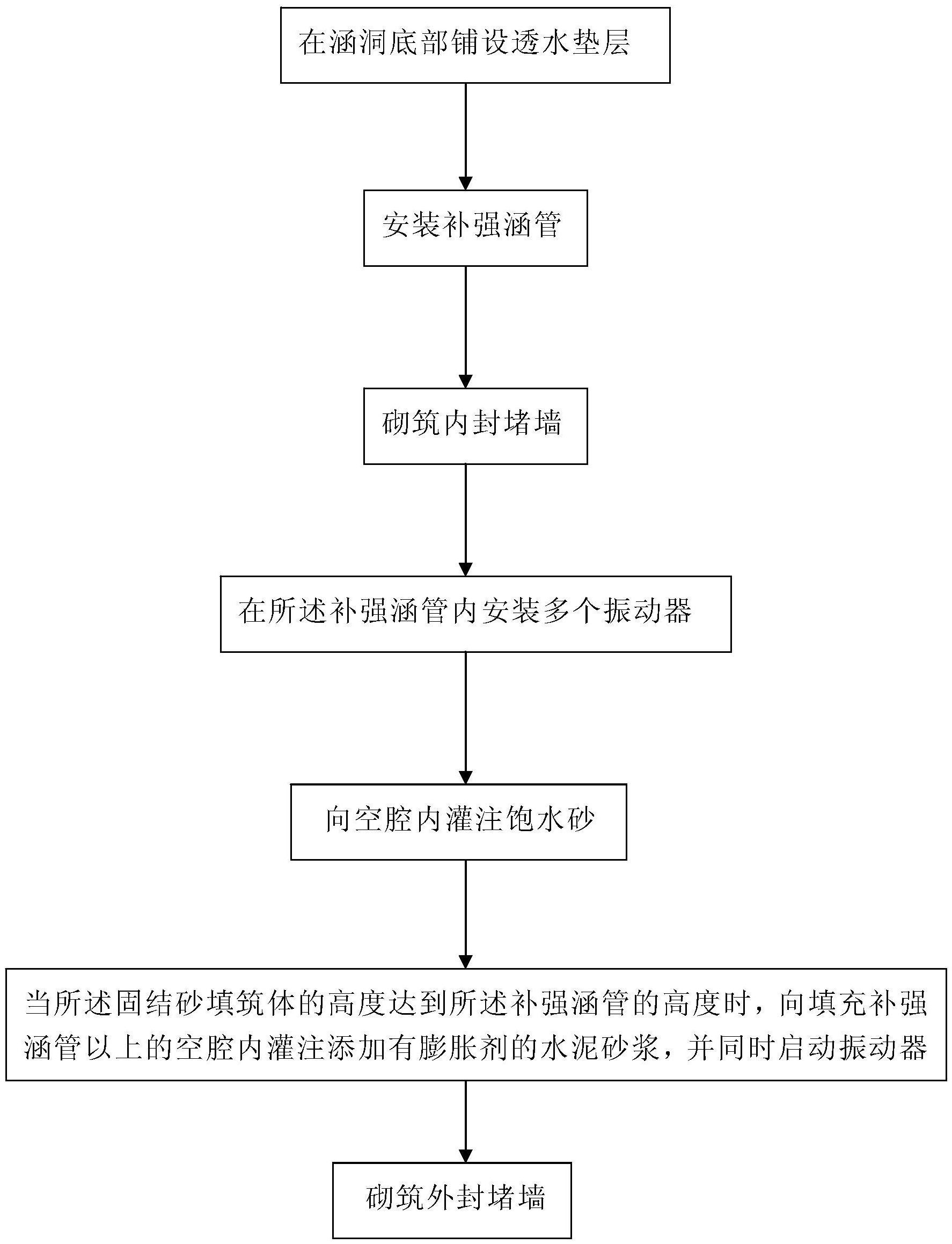步骤六、当所述固结砂填筑体的高度达到所述补强涵管(2)的高度时,向填充补强涵管(2)以上的空腔(7)内灌注添加有膨胀剂的水泥砂浆,并同时启动振动器(14);