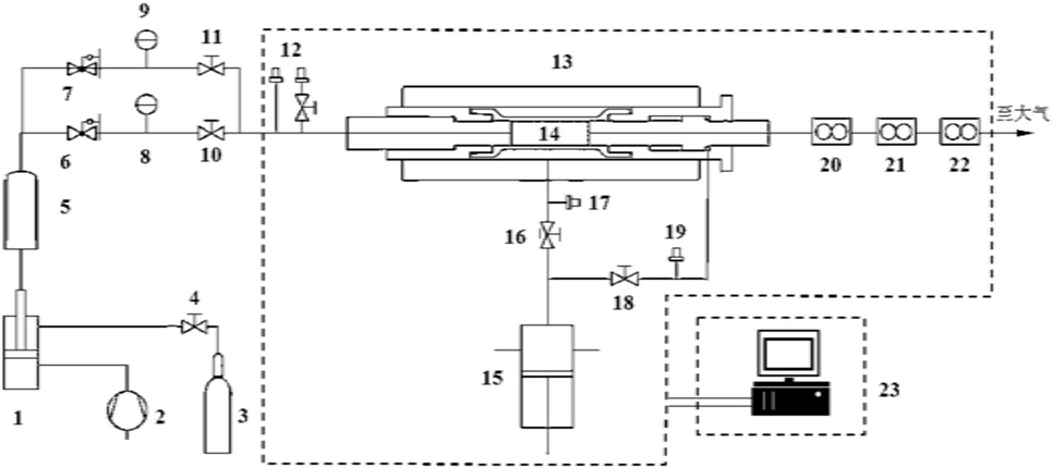 (5)在渗透气体无泄漏的条件下,通过气体增压系统将气体压力增大,略超过试验设定最大值,并存储于缓冲容器中;