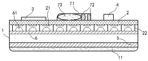 1.一种电子家用防丢器,本电子家用防丢器包括有壳体(1),在所述壳体(1)的底面固定安装有胶贴(11);其特征在于:在所述壳体(1)的内顶面安装有压敏板(2),在所述压敏板(2)的下表面等距阵列有压敏片(21),各所述压敏片(21)电性连接集电器(3),集电器(3)电性连接提示铃(4);在所述壳体(1)的内底面安装有固定片(5),在所述固定片(5)的上方还平行、正对的安装有活动片(6),所述活动片(6)通过弹性丝(22)与压敏板(2)连接,所述活动片(6)可在壳体(1)的侧壁上往复平移;自然状态下,所述弹性丝(22)呈张紧状态;在所述活动片(6)的上表面阵列排布有凸点(61),各所述凸点(61)与各所述压敏片(21)一一正对。