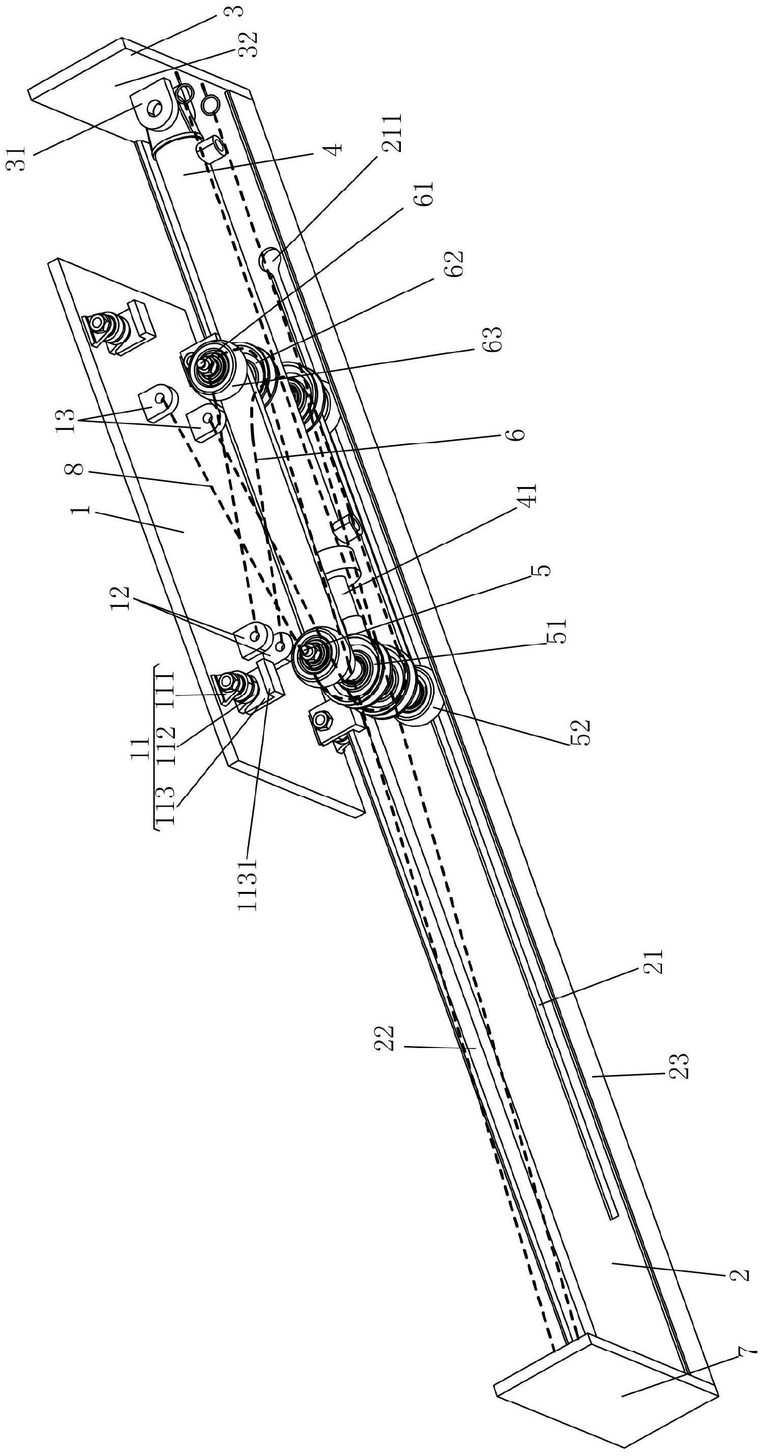 一对连接杆(6),所述的一对连接杆(6)与液压缸(4)平行设置且分别位于液压缸(4)的两侧,连接杆(6)的一端与长轴(5)连接,连接杆(6)的另一端朝着右固定板(3)的方向延伸,且在该端垂直设置一短轴(61),所述的短轴(61)在靠近液压缸(4)的一端设有第二滑轮(62),短轴(61)在靠近对应侧槽钢(2)的另一端设置第二滚轮(63),短轴(61)的该端端头卡入该侧槽钢(2)上的滑槽(21)内,并使第二滚轮(63)与槽钢(2)构成滑配;一左固定板(7),所述的左固定板(7)固定安装在一对槽钢(2)的长度方向的左端;钢丝绳(8),所述的钢丝绳(8)有两组,其中一组钢丝绳(8)的一端与左固定板(7)固定连接,另一端绕过一对第二滑轮(62)后与一对第一钢丝绳吊耳(12)连接;另一组钢丝绳(8)的一端与右固定板(3)固定连接,另一端绕过一对第一滑轮(51)后与一对第二钢丝绳吊耳(13)连接。