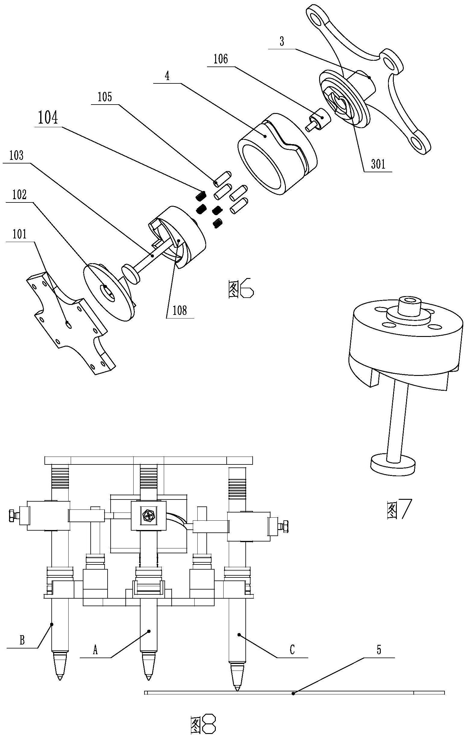 1.一种用于皮革画线的装置,包括与工业机器人连接且可对笔进行定位的连接板(3),其特征在于该装置还包括与所述连接板上固定的圆柱凸轮(4)、与圆柱凸轮同轴布置且底端连有底板(101)的转轴(103)、均匀布置于所述圆柱凸轮外侧的同一圆周面上且与所述圆柱凸轮配合以对笔进行定位和夹紧的若干个夹笔机构(2)以及与所述圆柱凸轮配合以根据不同皮料对笔的颜色要求而实现自动换笔功能的换笔机构(1)。