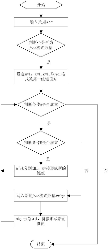 2.7)m=m+1,k=k+1,取json格式数据,键值为 值为转入步骤2.3),其中string为生成的新的无嵌套的json格式数据;