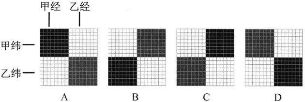 ①确定甲经、乙经为从左到右1∶1排列,甲纬、乙纬为从上到下1∶1排列,在表经与表纬的交织位置绘制显色组织,在里经与里纬的交织位置绘制里组织,表经与里纬的交织点经线全部提升,即全部为经组织点;里经与表纬的交织点经线全部下沉,即全部为纬组织点,②当显色组织为基本组织经向加强得到的影光组织时,在表经与里纬的交织位置绘制接结组织;当显色组织为基本组织纬向加强得到的影光组织时,在里经与表纬的交织位置绘制接结组织,③根据双经双纬渐变显色组织结构模型特征,依次完成四种交织结构的组织组合设计,并建立组织库,分别是甲经甲纬在织物表面交织显色组织库、乙经乙纬在织物表面交织显色组织库、甲经与乙纬在织物表面交织显色组织库,乙经与甲纬在织物表面交织显色组织库,(6)数码图案设计