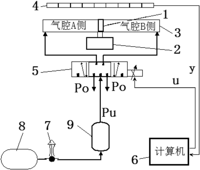 将式(5)估计得到的 数值用于实时更新式(2)中的参数,计算机(6)通过D/A转换器将经过限幅的控制信号输给比例阀(5),实时调节无杆气缸(3)中活塞(1)的位移y。