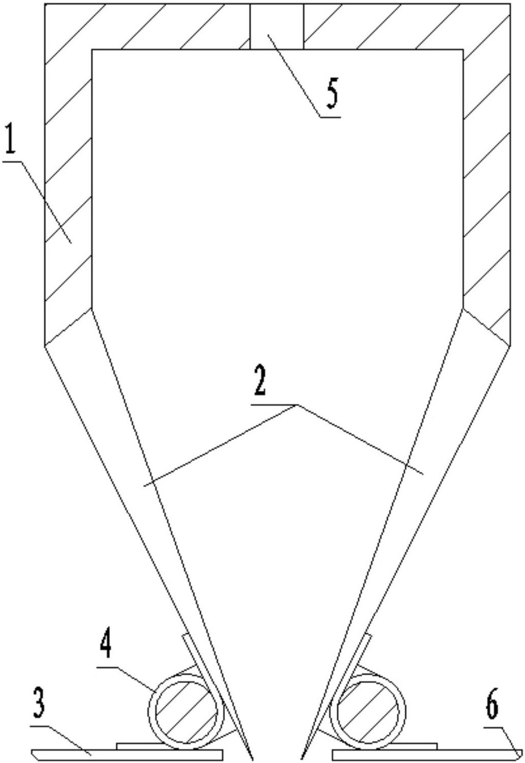 1.推平效果好的码布刀组件,其特征在于:刀架(1),刀架(1)的两侧均连接有码布刀(2);每个码布刀(2)外侧的底端部均铰接有压片(3),压片(3)和码布刀(2)之间连接有扭簧(4);所述两个码布刀(2)相互对称,且两个码布刀(2)均向中间倾斜设置。