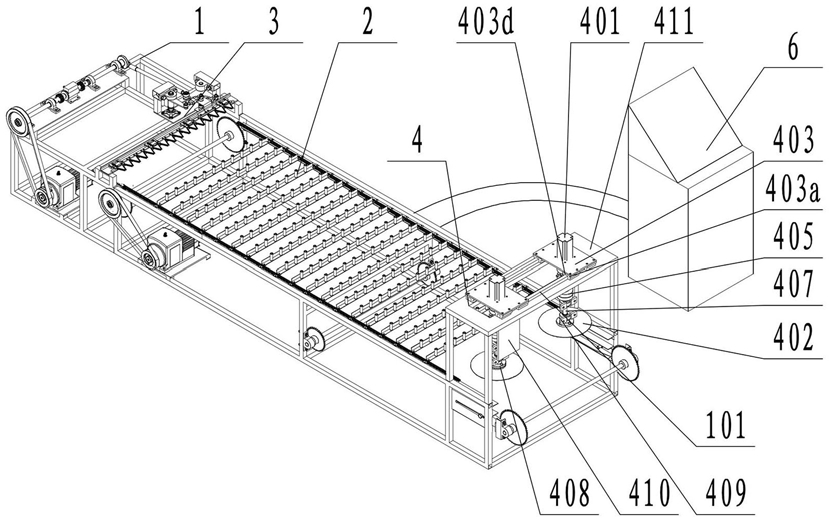 1.一种多切割平台茎秆作物切割试验装置,包括安装底座(1)、用于传输茎杆作物的传输机构(2)、双动刀切割机构(3)和控制器(6),所述安装底座(1)为长方体框架结构,所述传输机构(2)设置在安装底座(1)的中部,所述双动刀切割机构(3)和控制器(6)均设置在安装底座(1)的一侧,其特征在于:所述安装底座(1)上背向双动刀切割机构(3)的一端设置有圆盘刀切割机构(4),所述圆盘刀切割机构(4)包括圆盘刀支架(411)、并排设置的两个圆盘刀电机(401)和分别与两个圆盘刀电机(401)连接的两个圆盘刀(402),所述圆盘刀支架(411)固定连接在安装底座(1)上,所述圆盘刀支架(411)上设置有导轨(101),所述导轨(101)上设置有两个安装板(403),所述两个安装板(403)上均设置有导向块(403a),所述导向块(403a)底部开设有导向槽(403d),所述导轨(101)嵌入到导向槽(403d)内,使导向块(403a)在导轨(101)上滑移,所述两个圆盘刀电机(401)分别固定连接在两个安装板(403)上,所述圆盘刀电机(401)的转轴穿过安装板(1),并连接有第一联轴器(404),所述第一联轴器(404)和圆盘刀电机(401)的转轴通过键传动连接,所述两个安装板(403)下方均固定连接有固定板(410),所述固定板(410)上固定连接有扭矩传感器(405)和两个带立式座球轴承(409),所述扭矩传感器(405)与第一联轴器(404)键传动连接,所述两个带立式座球轴承(409)连接有传动轴(407),所述传动轴(407)中间设置有凸台,所述传动轴(407)穿入带立式座球轴承(409),凸台与带立式座球轴承(409)相抵触,所述传动轴(407)的顶端与扭矩传感器(405)之间设置有第二联轴器(406),所述传动轴(407)底部固定安装有端盖(413),所述端盖(413)上方设置有法兰盖(412),所述圆盘刀(402)设置在法兰盖(412)上方,所述圆盘刀(402)上方连接有法兰(408),所述法兰(408)与传动轴(407)键传动连接,所述法兰盖(412)、圆盘刀(402)和法兰(408)通过螺栓定位,并同轴固定连接。