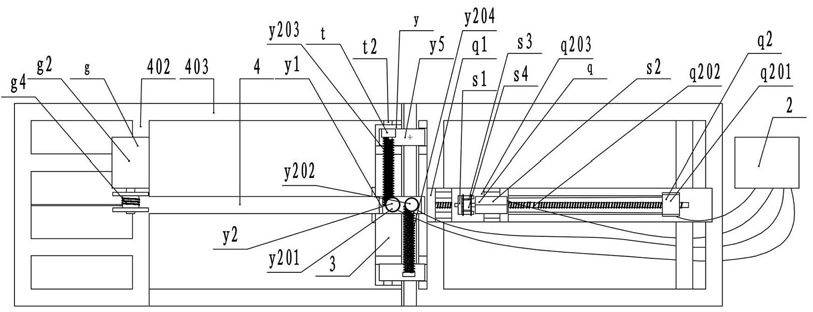 1.一种秋千座椅防撞击试验仪,包括铝球(1)、控制器(2)、秋千座椅(3)和固定支架(4),所述铝球(1)和秋千座椅(3)均通过绳索吊装在固定支架(4)上,所述铝球(1)内设置有加速度传感器,表面涂有印泥层(5),所述控制器(2)设置在固定支架(4)的一侧,所述加速度传感器与控制器(2)通过导线连接,其特征在于:所述固定支架(4)上设置有对秋千座椅(3)的撞击角度进行调节的角度调节机构(t)和在秋千座椅(3)撞击角度调节好以后进行固定的角度固定机构(g),所述角度调节机构(t)和角度固定机构(g)在固定支架(4)上依次分布,所述角度调节机构包括编码器(t1)和条状板(t2),所述编码器(t1)安装在固定支架(4)与秋千座椅(3)的绳索相连接的位置上,并通过导线与控制器(2)连接,所述编码器(t1)上具有旋转轴,所述条状板(t2)套在编码器(t1)的旋转轴上,并与吊装秋千座椅(3)的绳索并排设置,所述角度固定机构(g)包括第五电机(g2)、第一定滑轮(g3)、牵引绳(g4)和固定在秋千座椅(3)上的铁块(301),所述第五电机(g2)和第一定滑轮(g3)均安装在固定支架(4)上,所述牵引绳(g4)的一端缠绕在第五电机(g2)的旋转轴上,另一端绕过第一定滑轮(g3)后固定连接有电磁组件(g1),所述电磁组件(g1)包括连接板(g101)和两个电磁铁(g102),所述两个电磁铁(g102)与控制器(2)耦接,所述连接板(g101)与牵引绳(g4)相固定连接,所述连接板(g101)呈长条状,两个电磁铁(g102)的一端分别固定在连接板(g101)靠近其两端的位置上,另一端在通电时与铁块(301)相互吸引,断电时相互分离,所述固定支架(4)上设置有秋千座椅调节机构(y),所述秋千座椅调节机构(y)包括安装底座(y1)和蜗轮装置(y2),所述安装底座(y1)固定安装在固定支架(4)上,所述蜗轮装置(y2)包括第三电机(y201)、第四电机(y202)、第三螺杆(y203)、第四螺杆(y204)和两个悬挂底座(y5),所述第三电机(y201)和第四电机(y202)并排固定安装在安装底座(y1)上,所述第三螺杆(y203)设置在第三电机(y201)前方与第三电机(y201)传动连接,所述第四螺杆(y204)设置在第四电机(y202)的后方与第四电机(y202)传动连接,所述悬挂底座(y5)套在固定支架(4)上,悬挂底座(y5)与第三螺杆(y203)和第四螺杆(y204)固定安装,悬挂底座(y4)的下方开设有安装槽,安装槽的侧壁上开设有轴孔,所述编码器(t1)的轴穿过轴孔并与吊装秋千座椅(3)的绳索和条状板(t2)固定连接。
