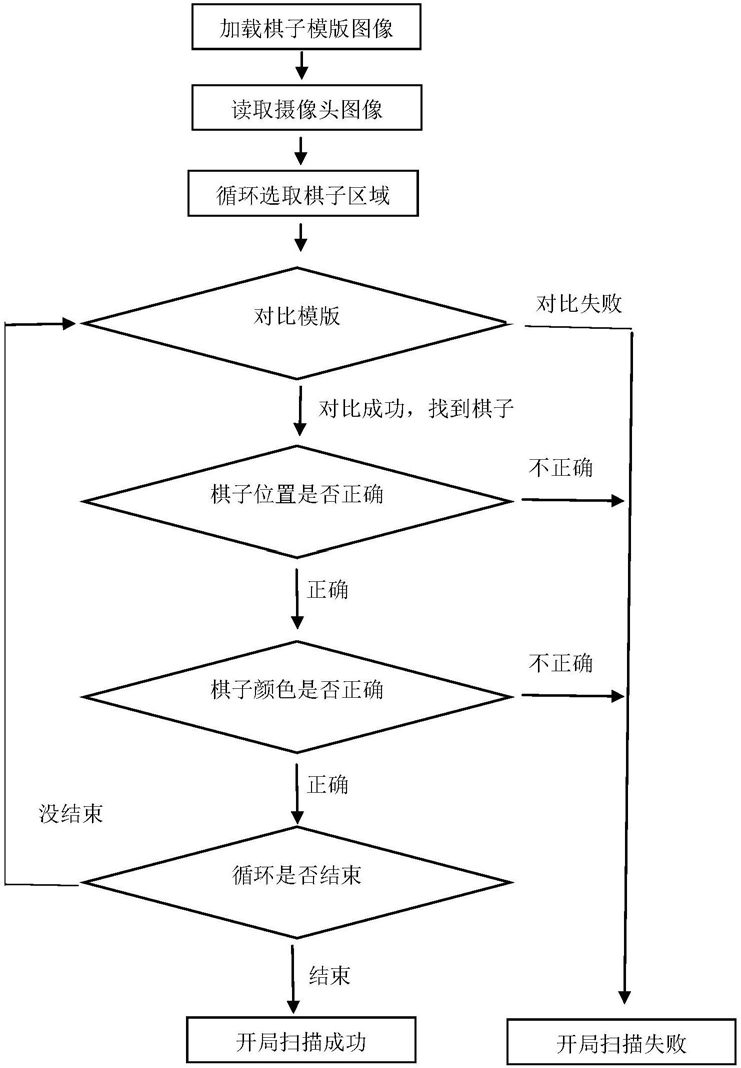 3)具体棋子的识别过程,对摄像头获取的开局图像进行处理,识别出各个位置的棋子是否正确放置,即判断是否放了棋子,放的棋子的种类是否正确,放的棋子的颜色是否正确,具体包括以下步骤:a棋子位置的确定,首先正确放置棋子,在采集的图像中确定各个棋子的坐标,下次就可以读取这些坐标信息来判断该位置的棋子是否放置正确,b棋子区域的获取,以之前保存的坐标信息为圆心,20个像素长为半径作圆就得到棋子区域,c棋子区域的具体处理,获得棋子的区域后建立目标棋子的数据信息,