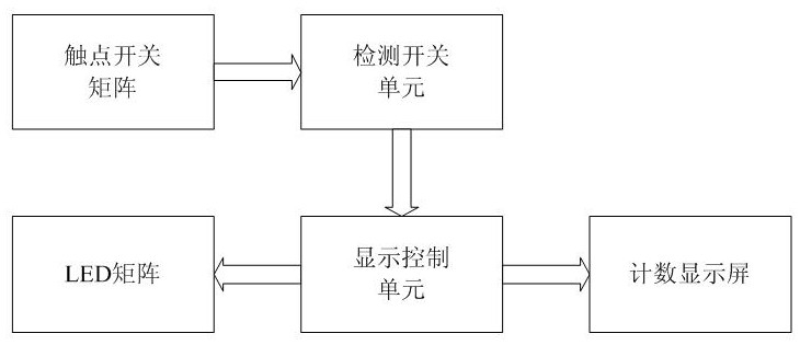 6.根据权利要求5所述的一种砂浆饱满度的检测方法,其特征在于,初始状态是触点开关全部接通,LED灯全部亮,通过检测开关单元检测触点开关的断通,触点开关断开表示此位置的触点开关接触到砂浆,当触点开关位置没有砂浆时,与检测开关单元连接的显示控制单元控制与该触点开关对应的LED灯保持亮的状态,所述检测开关单元根据触点开关的行列顺序依次检测每个触点开关的断通,将m行n列触点开关的断通状态信号发送给显示控制单元,显示控制单元对m行n列触点开关的断通状态信号进行处理,控制LED灯的灭亮以显示位于与其对应的触点开关的断通。