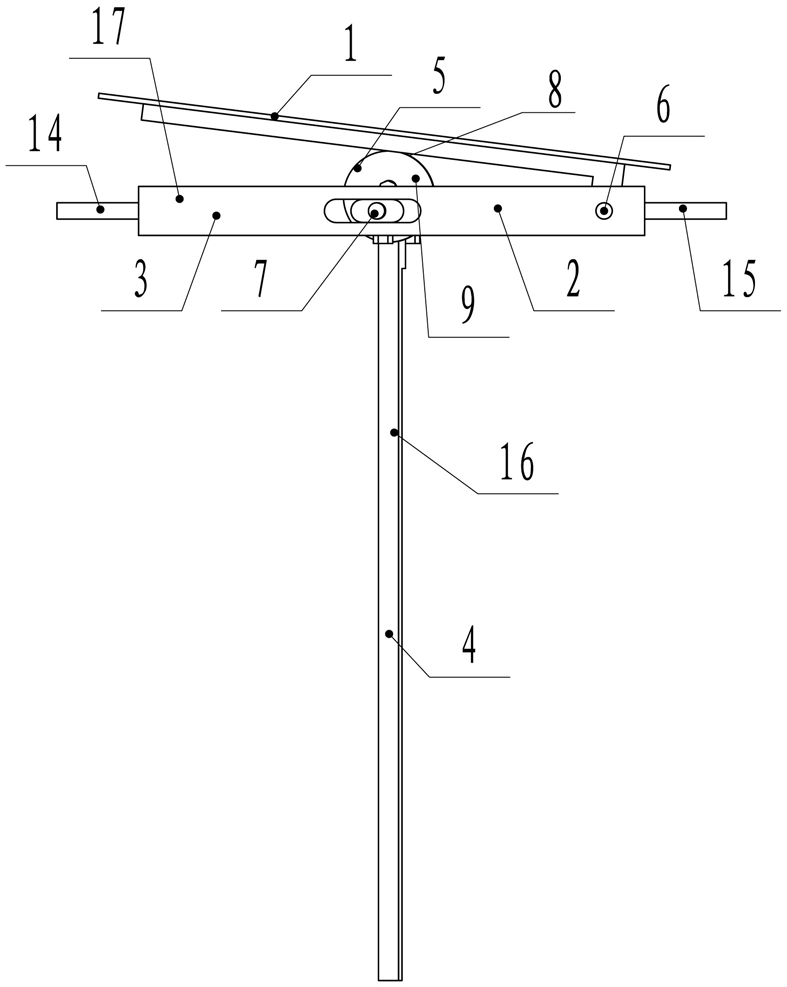 4.根据权利要求1或2或3所述的专用于太阳能聚光装置的反射镜机构,其特征在于:包括第一联轴(12)和第二联轴(13),所述左右转动部件(3)的左部设有左安装轴(14),所述左右转动部件(4)的右部设有右安装轴(15),所述前后转动部件(4)包括前后转动杆(16),所述反射镜(1)通过第一联轴(12)与左右转动部件(3)相铰接,所述前后转动杆(16)通过第二联轴(13)与左右转动部件(3)相铰接,所述左右转动补偿部件(5)安装在前后转动杆(16)上。