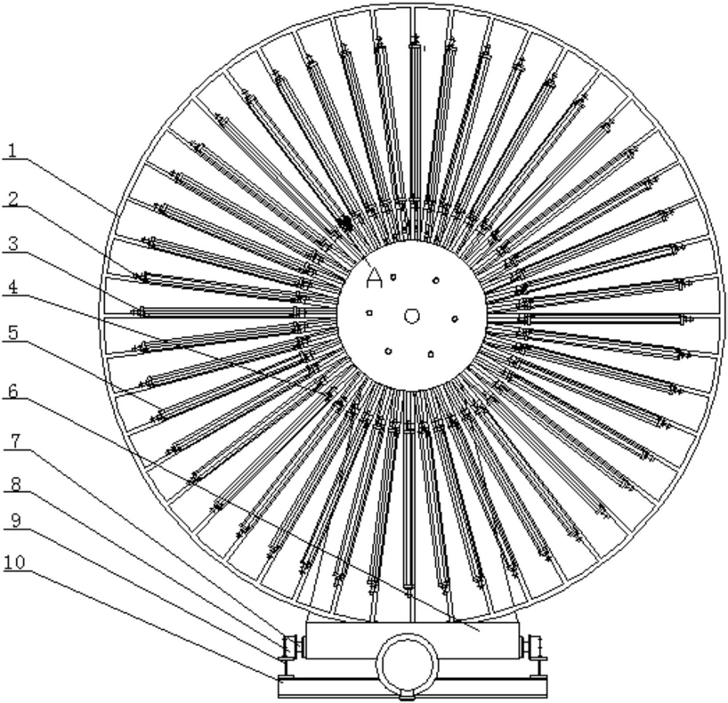 夹紧组件包括面齿轮以及回转气缸,大转盘的前面、后面分别对应配装转盘前端盖、转盘后端盖,回转气缸固定安装在转盘后端盖上,且回转气缸的输出轴穿出转盘前端盖后与面齿轮连接,而面齿轮则与摆动腹板外侧设置的锥齿轮相啮合;面齿轮在回转气缸提供的回转力驱动下,带动摆动腹板转动,调整摆动腹板与固定腹板之间的距离。