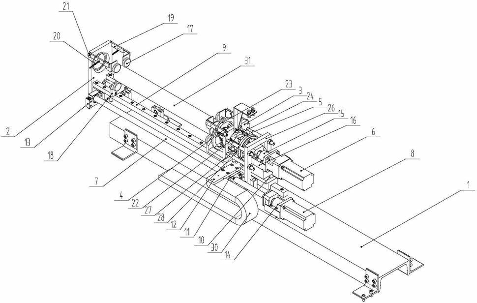 所述直线导轨(9)固定在底座(1)上,滑动座(10)套装在所述直线导轨(9)上,所述第一拱门(2)固定在直线导轨(9)的左侧端部,第二拱门(3)固定在所述滑动座(10)上,所述第一拱门(2)和第二拱门(3)上设有等大的圆形通孔,三爪卡盘(4)和管状工件(31)的直径均小于所述圆形通孔的直径;所述滚珠丝杠(7)平行于所述直线导轨(9)设置并固定在所述底座(1)上,所述滚珠丝杠(7)的一端通过丝杠轴承座(13)固定在第一拱门(2)上,滚珠丝杠(7)的另一端通过第一联轴器(14)连接驱动所述滚珠丝杠(7)转动的丝杠驱动电机(8),所述丝杠螺母(11)套装在滚珠丝杠(7)上,丝杠螺母(11)通过丝杠螺母连接板(12)与滑动座(10)固定连接;所述丝杠驱动电机(8)转动时带动所述滚珠丝杠(7)转动,从而带动丝杠螺母(11)、丝杠螺母连接板(12)和滑动座(10)构成的整体沿所述直线导轨(9)来回运动;