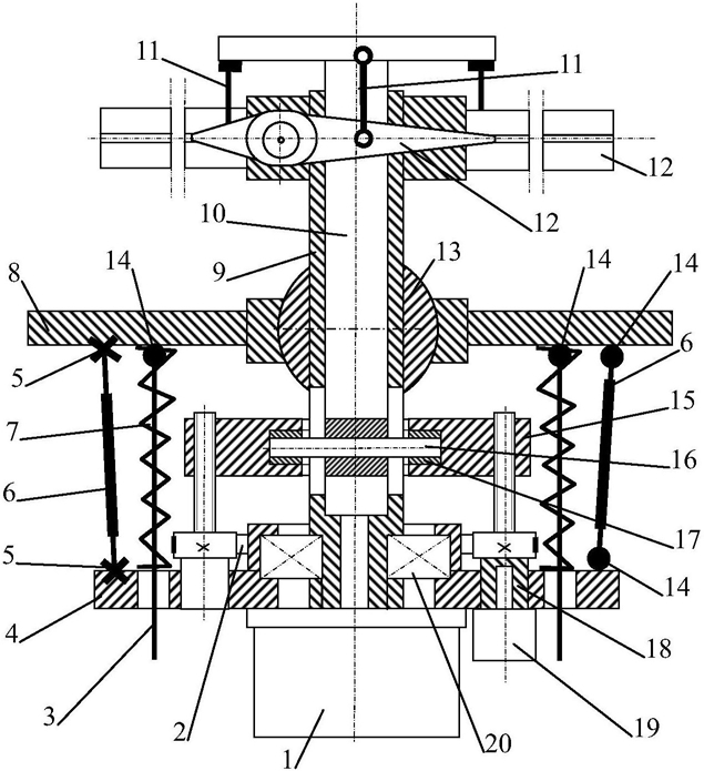 1.一种直升机旋翼复合运动并联驱动装置,其包括并联机构、旋翼摆翼机构、弹簧组,其特征在于:所述并联机构包括机座、动台、中间SP型被动约束分支、连接机座和动台的UPU型驱动分支和两个结构相同的SPS型驱动分支,实现旋翼主轴的轴向移动和绕机座中心球副的三维转动;所述机座中心设有凹形球面孔;所述动台上设有垂直动台面的中心通孔、小圆周均布的三个通孔和大圆周均布的三个通孔;所述中间SP型被动约束分支包括主轴、大轴承和球套,所述球套设有外球面和过球心的通孔,带轴心通孔的主轴与该球套的通孔圆柱副联接,该球套的外球面与机座的凹形球面孔球副联接,大轴承内、外环分别与主轴下端和动台中心通孔配合转动联接;所述UPU型驱动分支中的液压缸的两端分别通过万向副与机座和动台联接,所述万向副的外侧转动副轴线与联接处的圆周切线重合;所述SPS型驱动分支中的液压缸的两端分别通过球副与机座和动台联接;UPU型驱动分支和两个SPS型驱动分支在机座与动台之间圆周均布;所述旋翼摆翼机构包括上述主轴、翼组、发动机、推杆机构、心杆和连杆组;在上述主轴上端设有凸台,该凸台上设有与圆周相切且垂直主轴的与旋翼数量相等的均布的通孔,主轴从上端到下部设有轴心通孔,主轴下部设有与该轴心通孔正交的长槽通孔,主轴下端设有与主轴同轴的小通孔;所述翼组包括若干个相同的旋翼,旋翼始端设有纵向圆柱,该圆柱与上述主轴凸台的通孔转动联接;发动机固定在动台下面,发动机轴与主轴下端小通孔同轴键连接,驱动主轴和翼组旋转;所述推杆机构包括液压马达、三个螺杆、齿形带、环架、横轴和两个滚轮;所述螺杆上端为同轴的螺纹圆柱、其中部设有同轴的齿轮、其下端为设有同轴的内孔的圆柱;所述环架上设有垂直环架的环心通孔和三个圆周均布的螺纹通孔,该环心通孔壁上设有矩形截面的圆环槽;三个螺杆上端的螺纹圆柱与上述环架的三个螺纹通孔螺纹联接,三个螺杆下端的圆柱与上述动台的三个小圆周通孔转动联接,齿形带与三个螺杆的齿轮同步啮合转动;液压马达与动台连接,其驱动轴与其中一个螺杆下端的内孔同轴键连接;所述心杆上端设有凸台,下端设有与心杆轴线正交的圆通孔;所述横轴中部与心杆下端圆通孔配合连接,横轴两端穿过上述主轴长槽通孔,该主轴长槽通孔通过横轴驱动心杆随主轴同步转动;上述横轴两端与两个滚轮内环固连;两个滚轮的外环与环架的圆环槽滚动接触,液压马达通过齿形带驱动三个螺杆同步转动和环架沿主轴移动;推杆机构通过环架和横轴驱动心杆沿主轴轴线移动,心杆上端凸台通过连杆组与旋翼连接;所述弹簧组包括在机座与动台之间圆周均布的三个导杆和三个弹簧,导杆的一端分别与机座下面球副联接,该导杆的另一端穿过动台的大圆周通孔为自由端,弹簧套在导杆上,弹簧的两端分别抵在机座的下面和动台的上面。