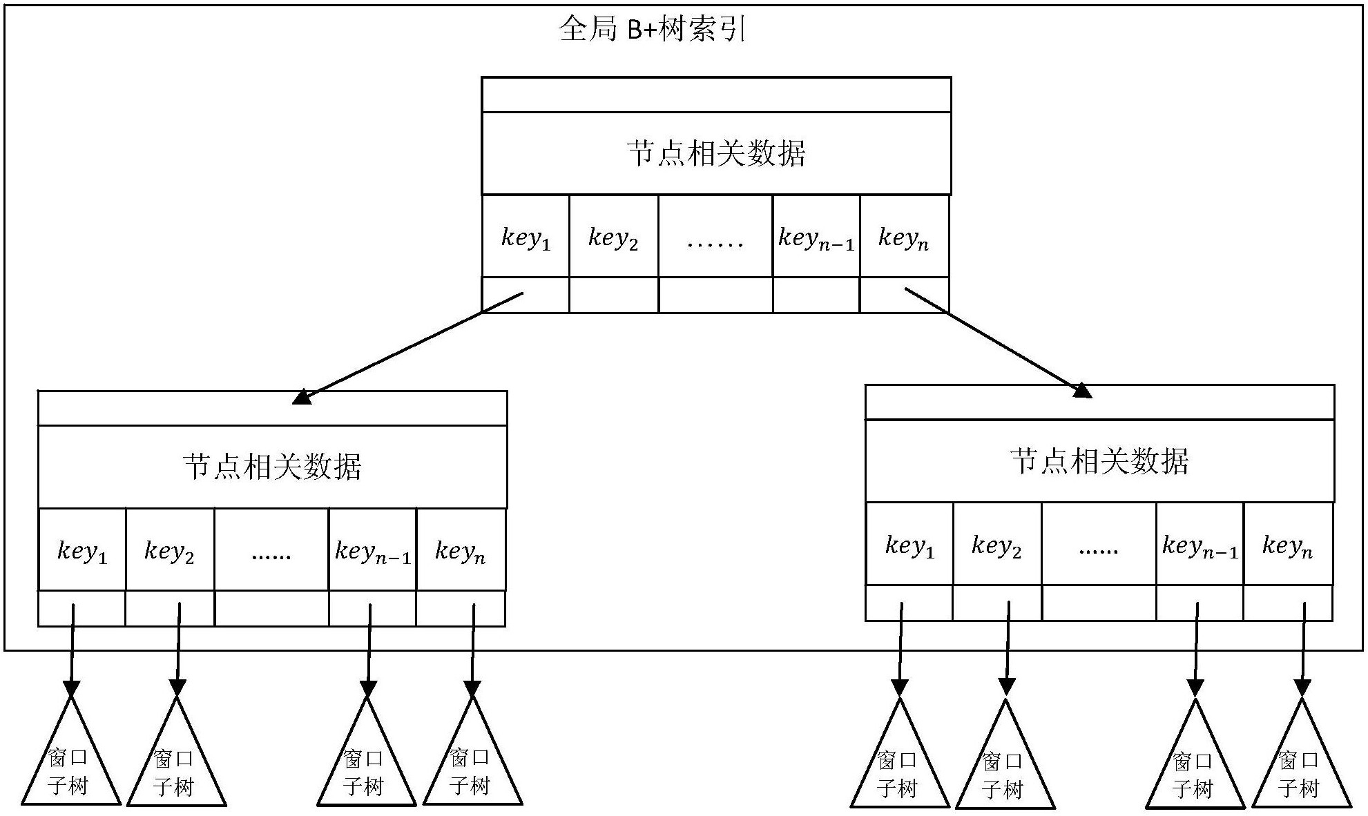 步骤2)~7)构建窗口数据的子B+树分成三大步骤:步骤2)的数据接收阶段、步骤3)的排序阶段、步骤4)~7)的建树阶段;在构建树阶段,将构建树阶段分成计算树结构阶段和构建树节点阶段,通过计算树结构,获得构建树所用的空间情况及树结构情况,进而通过统一申请、分配空间,使树的地址空间连续;在计算树结构的基础上并行构建相对独立的树节点,提高建树效率;在数据接收阶段,边接收数据边排序,将排序与接收数据并行;在排序阶段进行赋值交换,在构建树阶段进行引用操作,实现排序与树构建并行;实现排序与数据接收并行,排序与树构建并行,将建树的三大主要操作并行,降低建树时延,提高建树效率,从而提高计算机处理效率,提高数据吞吐量。